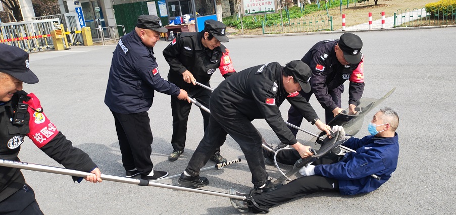 在反复警告无效的情况下,安保人员抓住时机、果断出击,利用防暴钢叉锁住“歹徒”下肢,用盾牌将其逼退至墙角,最终合力将其成功制服,有效避免了事态升级。整个演练过程紧张有序、环环相扣,参演人员分工明确、配合默契,达到了预期效果。