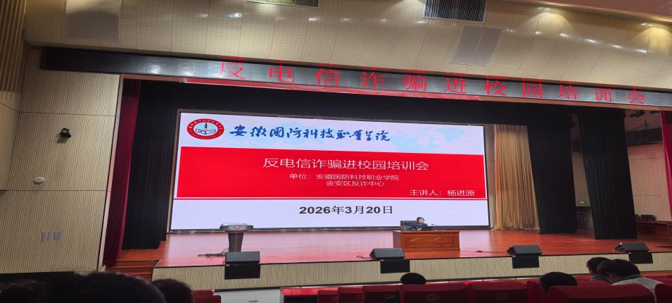 为进一步筑牢校园反诈安全防线,切实增强全体在校学生防范电信诈骗的意识,全力守护师生财产安全,营造平安和谐的校园环境,2026年3月20日下午,我校特邀六安市公安局金安分局反电信网络诈骗中心,走进安徽国防科技职业学院产教融合中心多功能厅,开展防范电信网络诈骗专题宣传讲座。