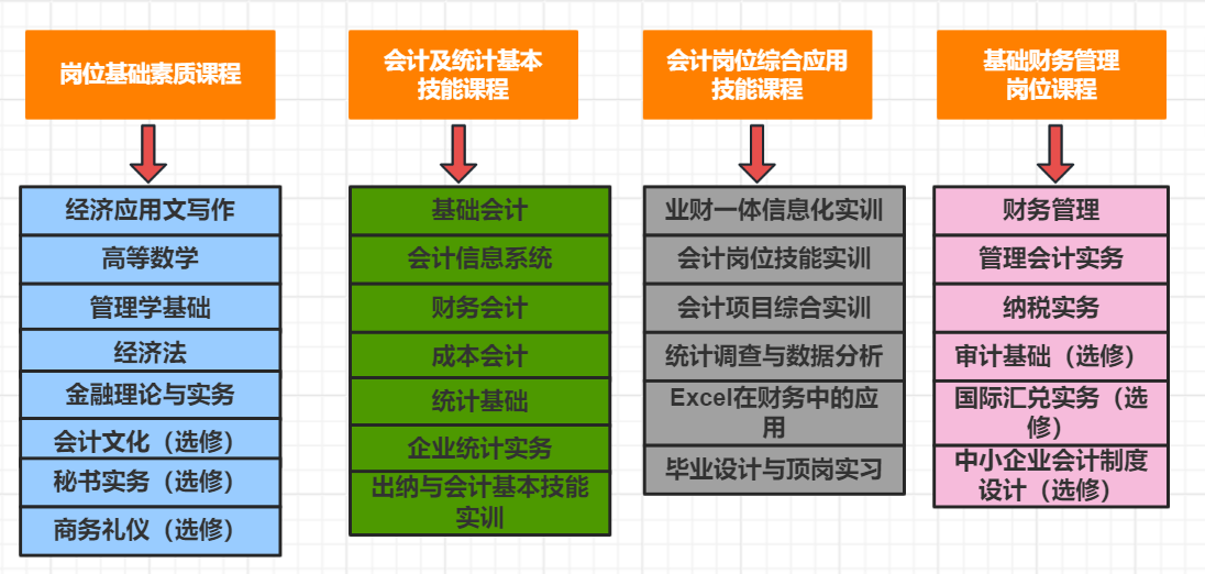 以企业会计和统计相关岗位职业能力要求为核心,以初级会计师能力要求为标准,设置理论和实践教学环节,课程体系既突出会计和统计岗位一线的技能培养,又注重学生的职业发展。