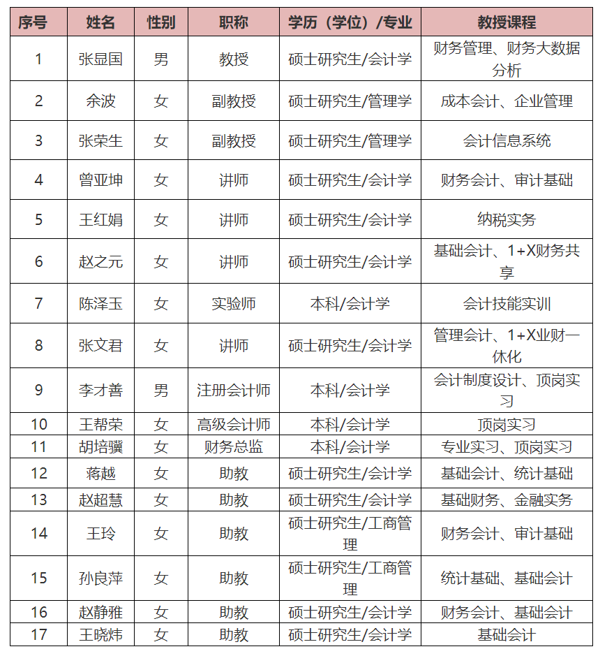 本专业培养理想信念坚定,德、智、体、美、劳全面发展,具有一定的科学文化水平,良好的人文素养、职业道德和创新意识,精益求精的工匠精神,较强的就业能力和可持续发展能力,掌握本专业知识和技术技能,面向会计、统计、金融服务等职业群,能够从事会计核算、统计核算与分析、纳税筹划与申报、财务管理、企业业财一体信息化服务等工作的高素质技术技能人才。