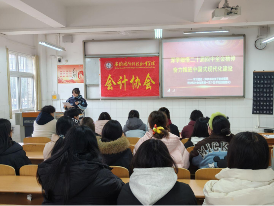 本网讯(学生通讯员 汪洳莹)时代浪潮奔涌向前,青春担当勇立潮头。为引导青年学子深刻把握党的二十届四中全会精神核心要义,将专业所学与国家发展同频共振,我校会计协会于2025年12月24日(星期三)下午3:00在2教105举办党的二十届四中全会精神学习活动,由会计协会指导教师赵超慧带领协会成员学习,通过理论讲解,推动全会精神在大学生群体中入脑入心,激励同学们以本专业力量赋能中国式现代化建设。