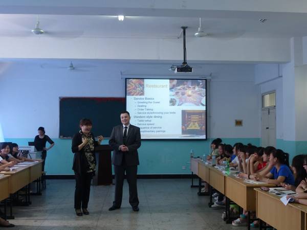 5月24号,Rose携上海扬子江万丽大酒店宴会统筹总监Jane和西餐餐厅经理Michael再次来到我校。Michael主要介绍了西餐礼仪及服务规范。Jane教会同学们,要为酒店重要的客人准备他所需要的一切。