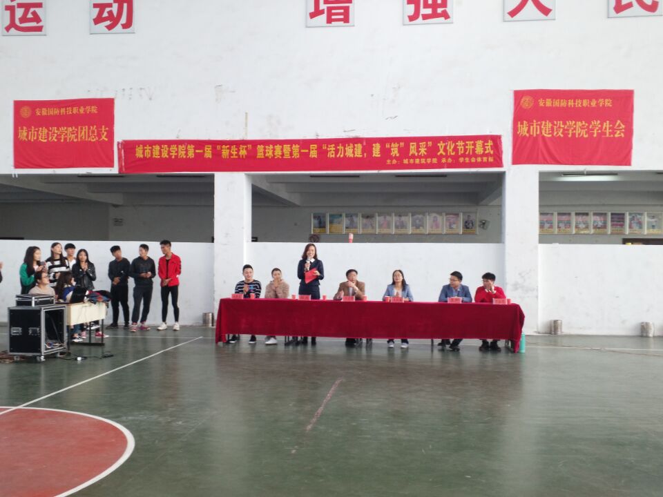 为营造良好的校园文化氛围,增强团队精神和班级凝聚力,展现大学生积极向上的精神风貌,2017年10月14日上午9时,由城市建设学院举办的第一届“新生杯”篮球赛暨第一届“活力城建,建“筑”风采”文化节开幕式在室内体育馆一楼篮球场拉开帷幕。城市建设学院党总支副书记叶启衡、副院长王红林、团总支书记张凤、辅导员袁野、辅导员罗丞筠莅临现场,学院团总支学生会全体学生干部、参赛代表队和班级代表参加了开幕式。