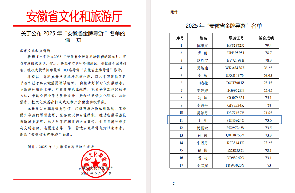 培训期间,李礼老师始终保持高度的学习热情,认真聆听每一节课程,积极参与课堂互动与研讨交流,主动向行业专家和领军人物虚心求教,展现出扎实的专业素养和严谨的学习态度。经过系统学习与严格考核,李礼老师以优异的成绩脱颖而出,在通过测试的百名学员中综合排名第11位,被安徽省文化和旅游厅授予“安徽省金牌导游”称号。
