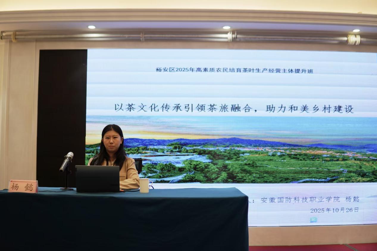 为加快裕安区茶产业高质量发展,进一步提升茶产业从业者的生产加工技能与市场营销水平,10月26日上午,六安市裕安区农业农村局在万乘云汉大酒店举办了“裕安区2025年高素质农民培育茶叶生产经营主体提升班”。来自全区的40余名茶叶生产经营主体负责人及新型职业农民参加了此次培训。我院酒店管理与数字化运营专业教师、国家二级茶艺技师杨懿博士应邀担任培训讲师,并作题为《以茶文化传承引领茶旅融合,助力和美乡村建设》的专题讲座。