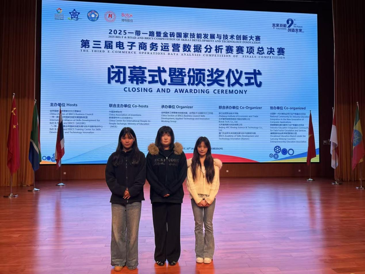 10月31日, 2025年一带一路暨金砖国家技能发展与技术创新大赛第三届电子商务运营数据分析赛项决赛在浙江经贸职业技术学院举行。我校经贸管理学院教师朱小平、吴英指导的学生唐红燕、何梦瑶、张文君组成的参赛团队荣获全国总决赛三等奖。