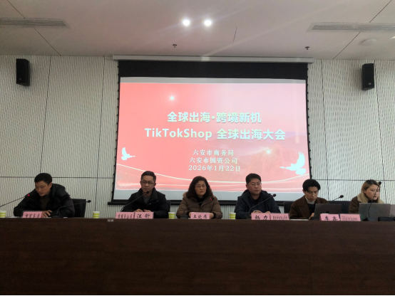 为推进我校电子商务专业向跨境电商转型升级,深化校企合作与产教融合,着力培养适应全球数字贸易的高素质人才,2026年1月22日,我院应邀参加由六安市商务局与市国资公司联合主办的“全球出海、跨境新机——TikTok Shop全球出海大会”。