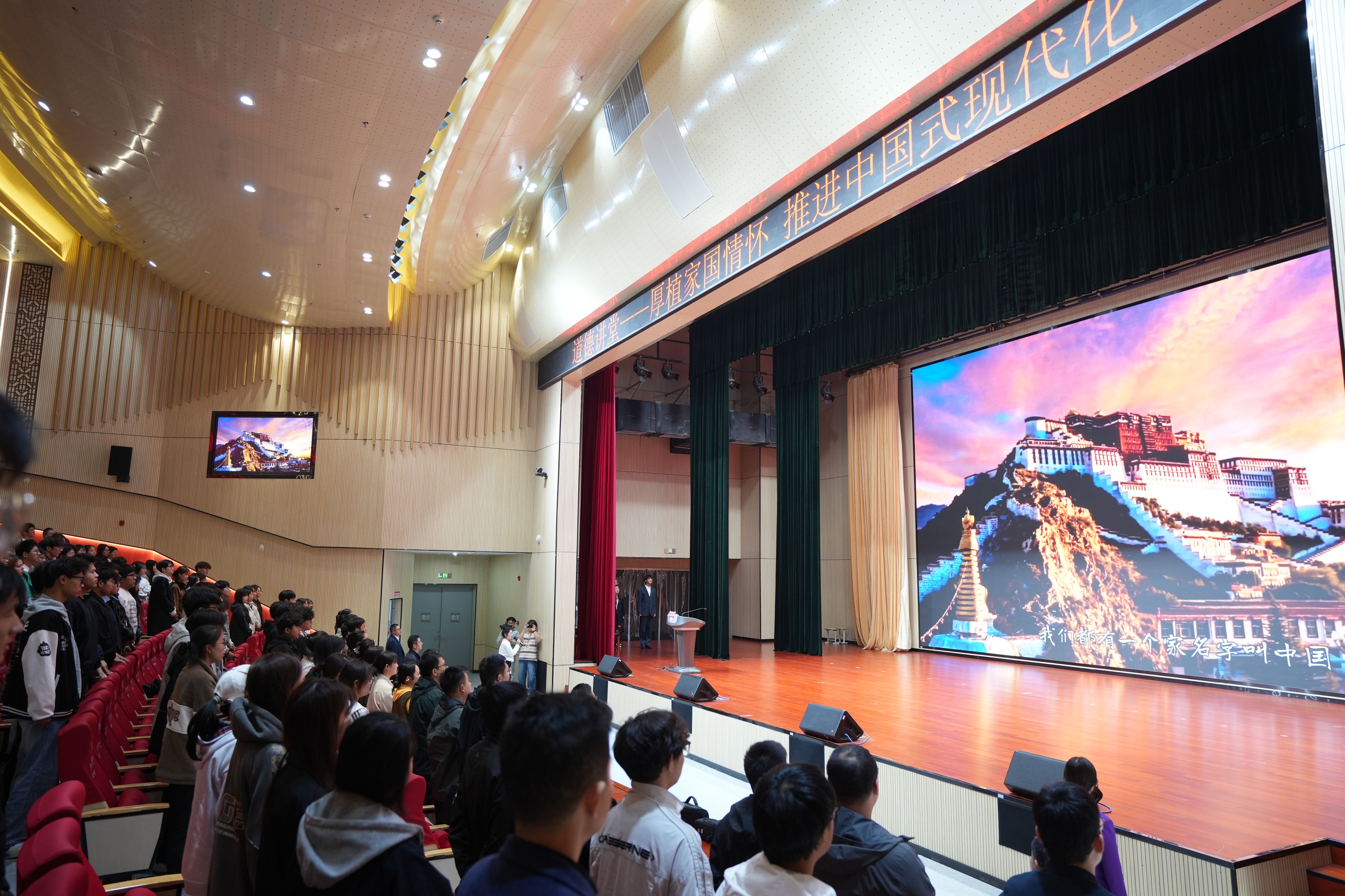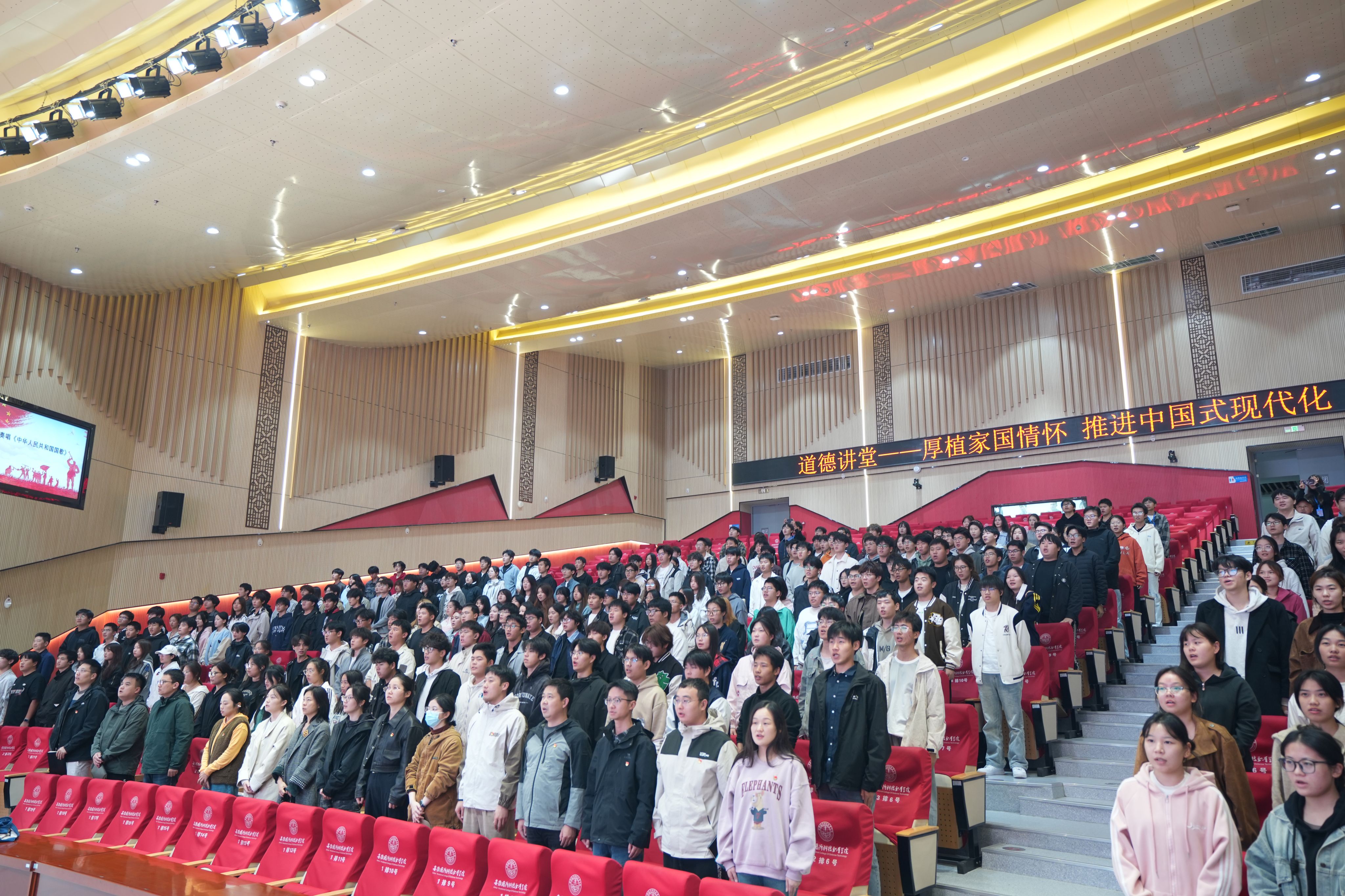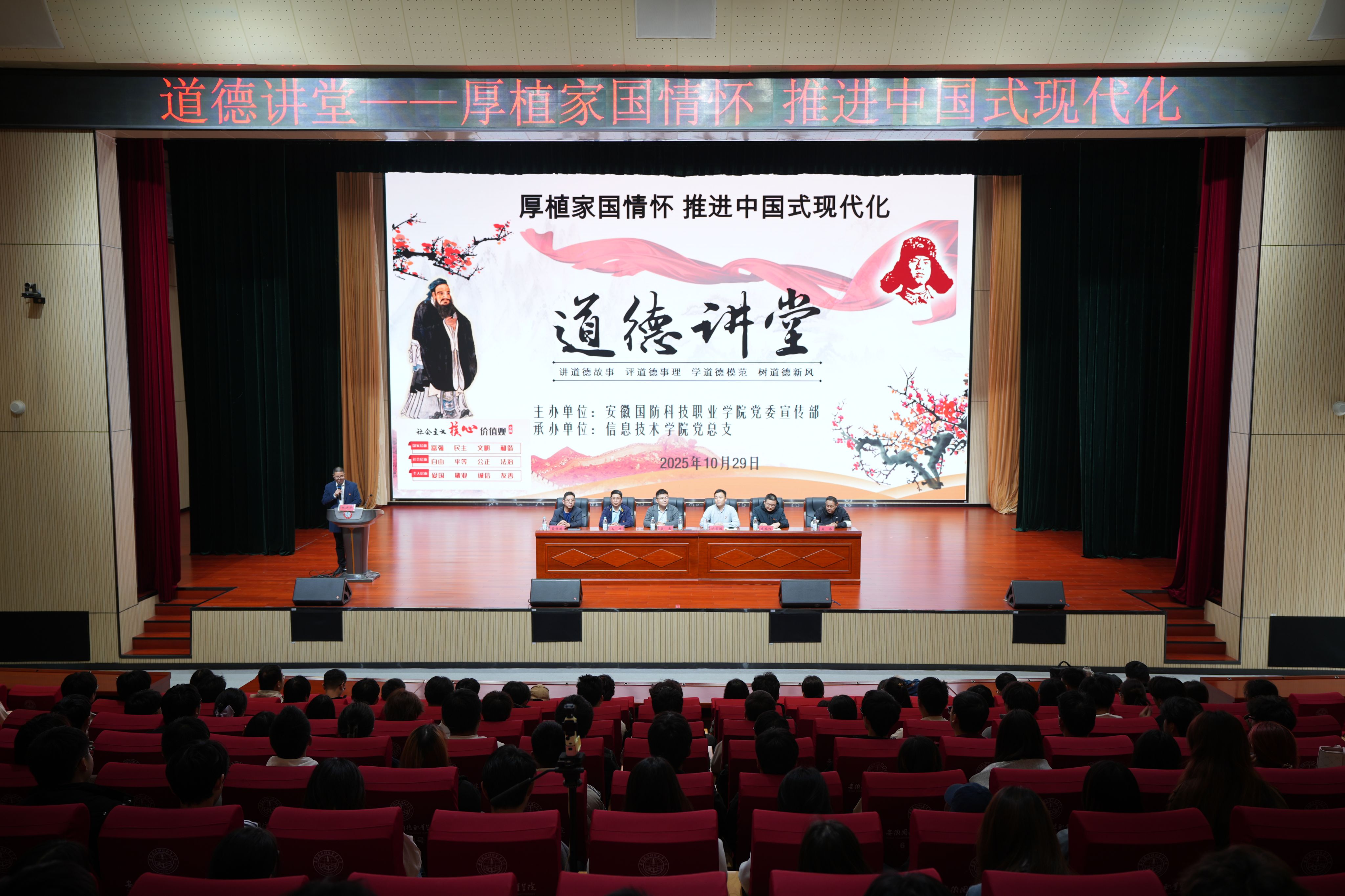 本网讯(信息技术学院 马士君)为热烈庆祝中华人民共和国成立76周年,持续深入学习贯彻习近平新时代中国特色社会主义思想和党的二十届四中全会精神,扎实培育和践行社会主义核心价值观,传承中华优秀传统文化,凝聚师生奋进力量,引导广大青年在推进中国式现代化建设中挺膺担当、建功立业,10月29日下午,由校党委宣传部主办、信息技术学院党总支承办的“厚植家国情怀 推进中国式现代化”主题道德讲堂在产教融合中心报告厅隆重举行。校党委委员、信息技术学院院长沙有闯,信息技术学院党总支书记王胜,党委宣传(统战)部副部长朱其阳,信息技术学院副院长雷惊鹏、组织员吴伟等应邀出席,各二级学院师生代表共300余人参加了此次活动。活动由信息技术学院党总支副书记杜洪宇主持。