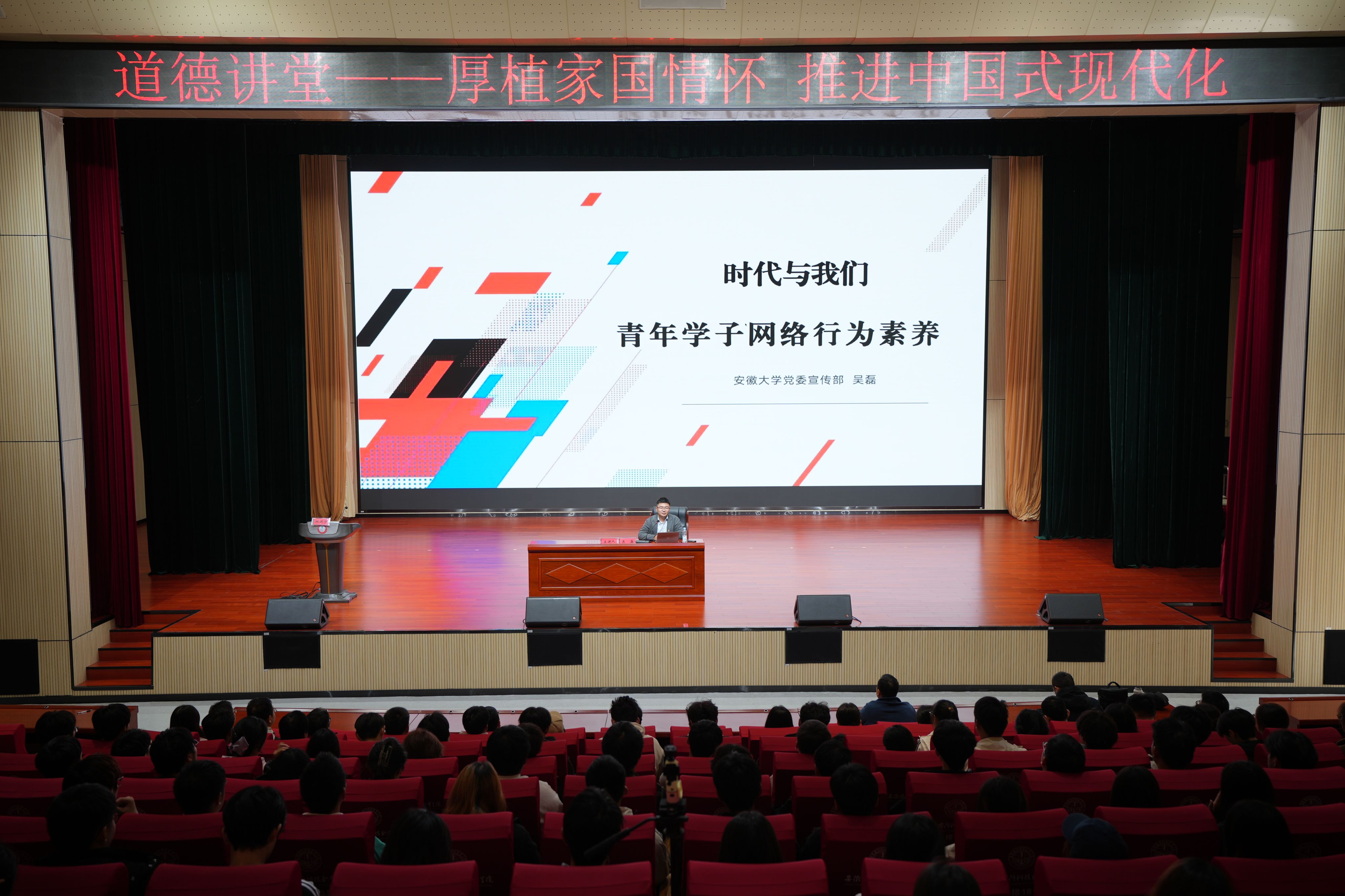 聆听讲座,明晰青年之责。活动邀请了安徽大学党委宣传部副部长、安徽省高校网络思想政治工作中心副主任吴磊作专题讲座。吴磊以《提升网络行为素养:青年学子在中国式现代化中的责任与作为》为题,从大学生媒介生活现状切入,结合典型案例剖析不良网络行为的危害,围绕“优化信息认知系统”“提升网络辨别能力”“传播网络正能量”三大核心,用详实的数据、生动的案例和深刻的阐释,为师生上了一堂兼具理论深度与实践指导意义的道德课。整场讲座深入浅出、引人深思,为青年学子在网络时代践行家国责任指明了方向、提供了遵循。