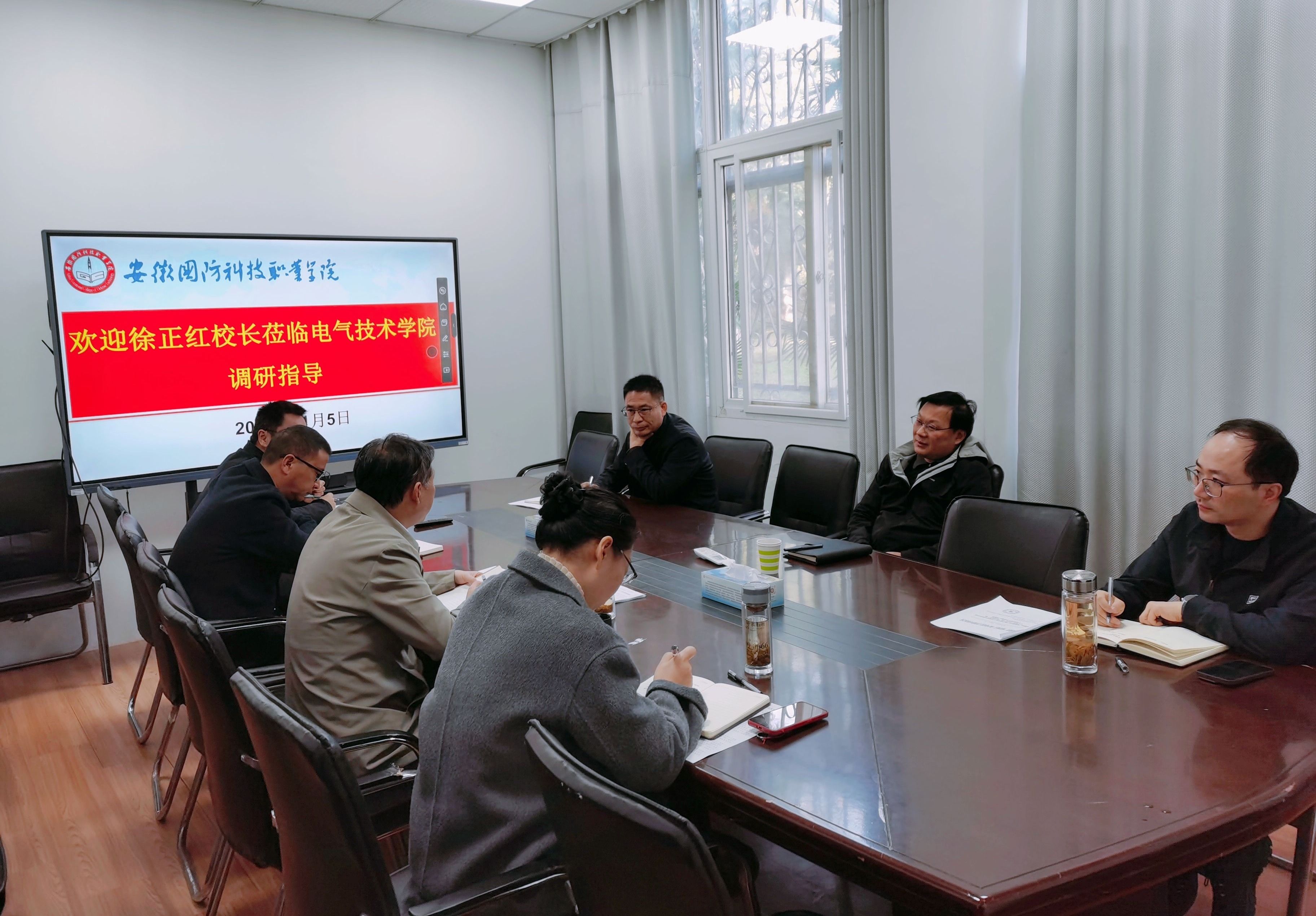 本网讯(电气技术学院 程坤)11月5日,校长徐正红、教务处处长朱修传、双高办主任韩玉龙一行赴电气技术学院开展专题调研,重点围绕职教本科建设、“十五五”发展规划编制及产教融合等核心议题召开座谈会。电气技术学院党总支班子成员参加,会议由电气技术学院院长李翔主持。