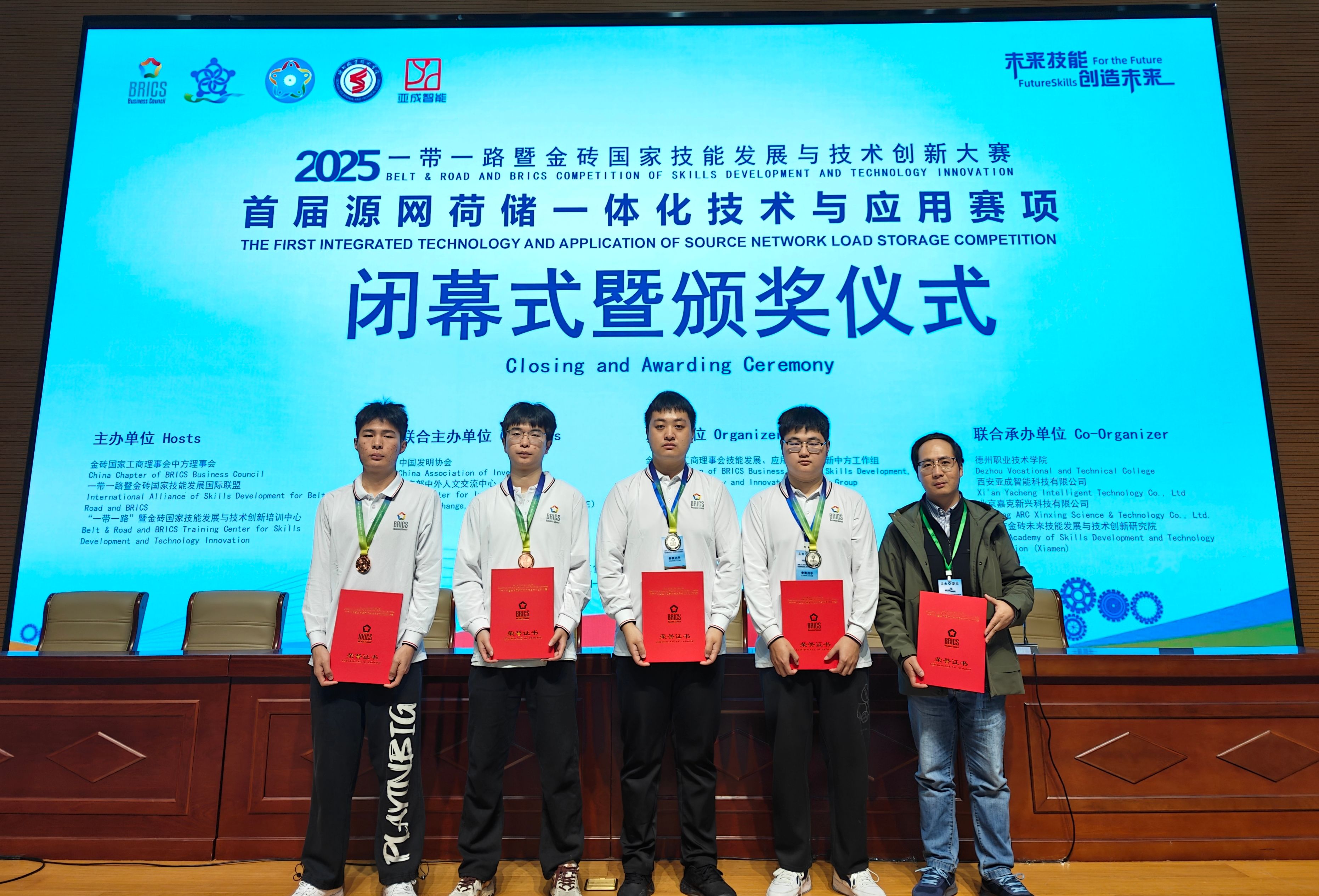 本网讯(电气技术学院 侯超群)11月5日至8日,由金砖国家技能发展与技术创新大赛组委会、“一带一路”暨金砖国家技能发展国际联盟、中国发明协会、教育部中外人文交流中心等单位组织的2025年“一带一路”暨金砖国家技能发展与技术创新大赛首届“源网荷储一体化技术与应用”赛项全国总决赛在德州职业技术学院举行。我校电气技术学院侯超群、侯超众等老师指导的2支队伍,从参赛的近百支队伍中脱颖而出,国防1队(学生:李中园、陶金浩)获二等奖,国防2队(学生:于爱林、周茂盛)获三等奖,学校荣获优秀组织奖。