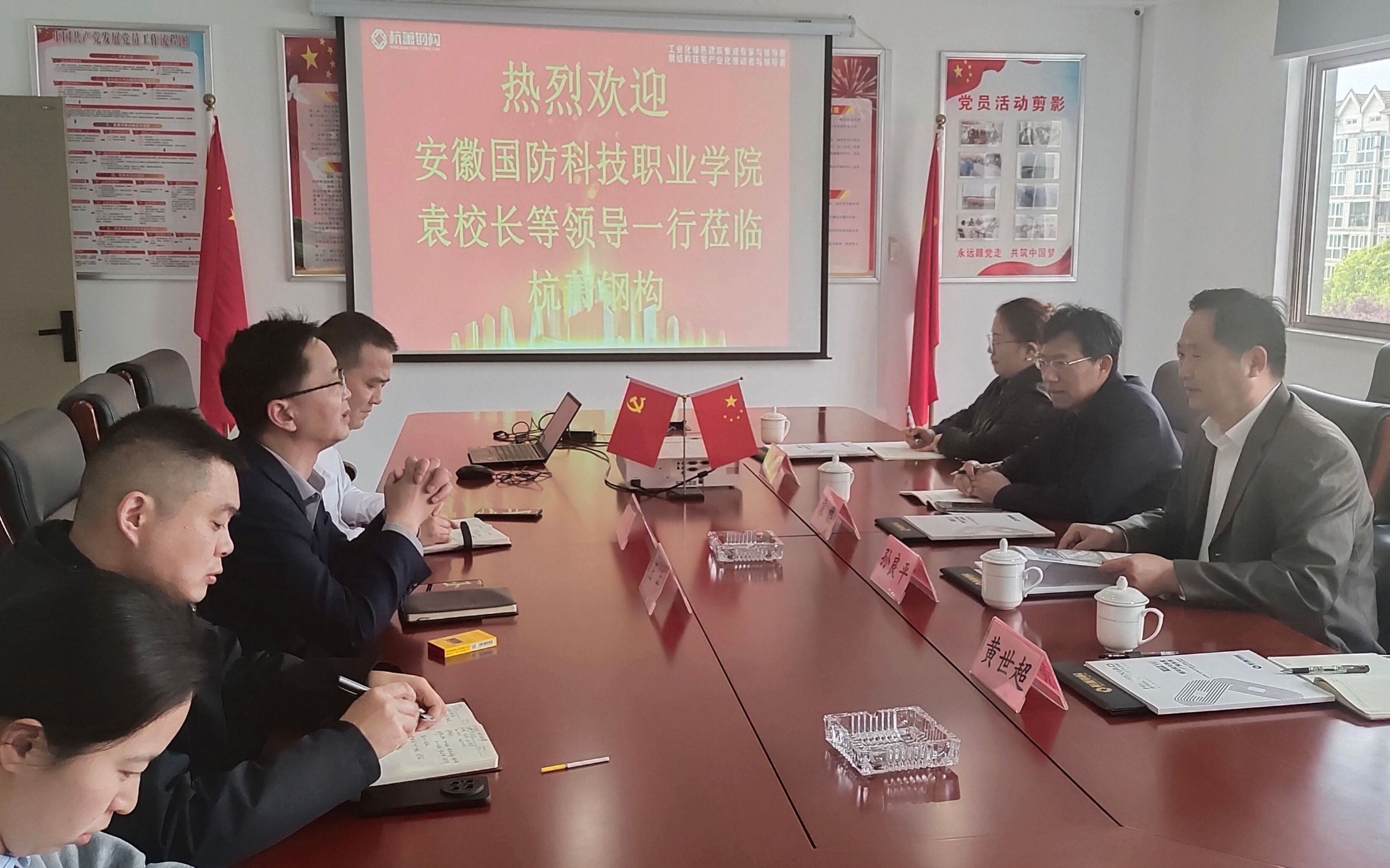 在杭萧钢构股份有限公司六安分公司,调研团队与企业负责人举行了座谈会,企业负责人介绍了企业经营情况、校企合作、人才晋升通道等情况。袁旗详细介绍了学校办学特色与优势专业,双方围绕校地人才合作、实习平台共建等进行了深入探讨。随后,在企业负责人陪同下,深入生产厂区,详细了解企业发展现状及人才需求。双方围绕校企协同育人、师资与骨干交流、毕业生实习就业等方面进行深入交流。