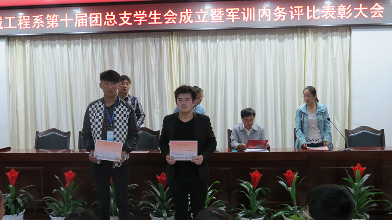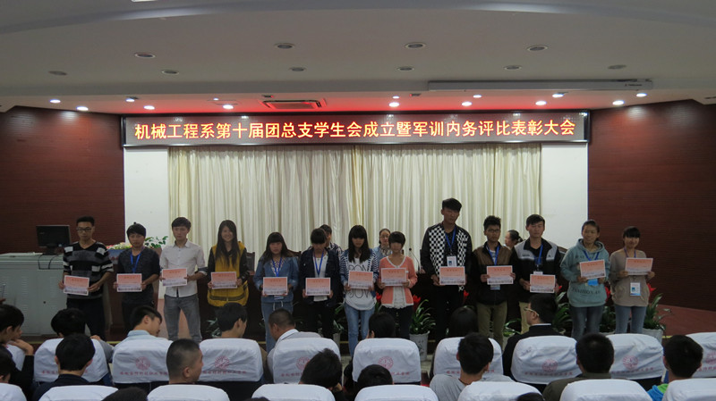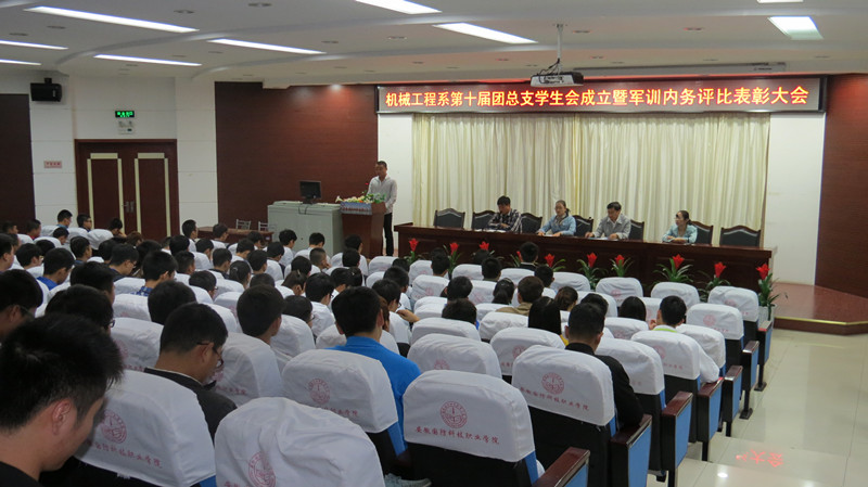2014年10月16日晚,机械工程系在图书馆报告厅召开第十届学生会成立暨军训内务评比表彰大会。系党总支书记吴方庭、党总支副书记陈思、团总支书记孙策、14级辅导员杨静出席了大会,第十届学生会全体成员、各班班长、团支部书记以及各寝室长参加了大会。会议由孙策主持。