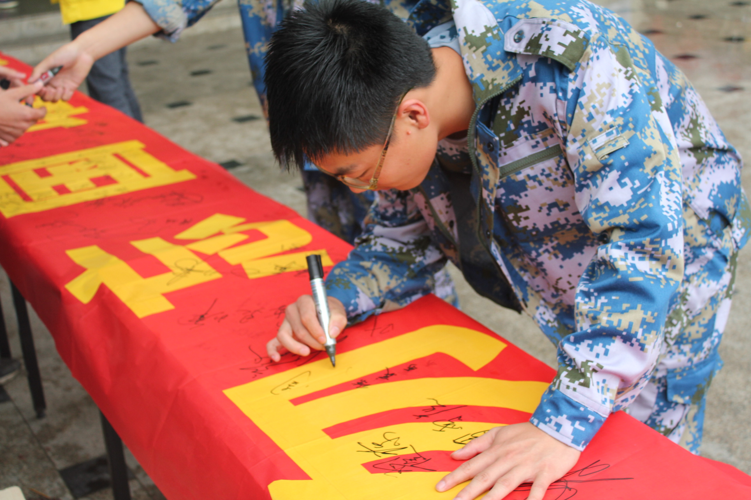 签名活动,同学们个个表情庄严。汽车系2013级张骏同学表示,当代大学生爱国诉求应该理性而成熟,国家日益强大让我们充满自信,我们努力学习,做好自己的事就是爱国。机电系2014级朱煜说“我们纪念‘九一八’,并不是宣泄仇恨,而是希望我们每一位大学生、每一位国民都要有忧患意识和自强精神。”(院团委大学生记者团)