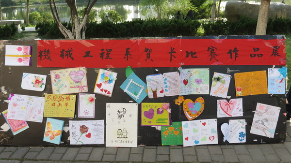 为感恩父母,丰富大学生活,在母亲节来临之际,机械工程系宣传部与劳生部合办的自制感恩贺卡作品展于5月11日—12日在食堂门口顺利举行。