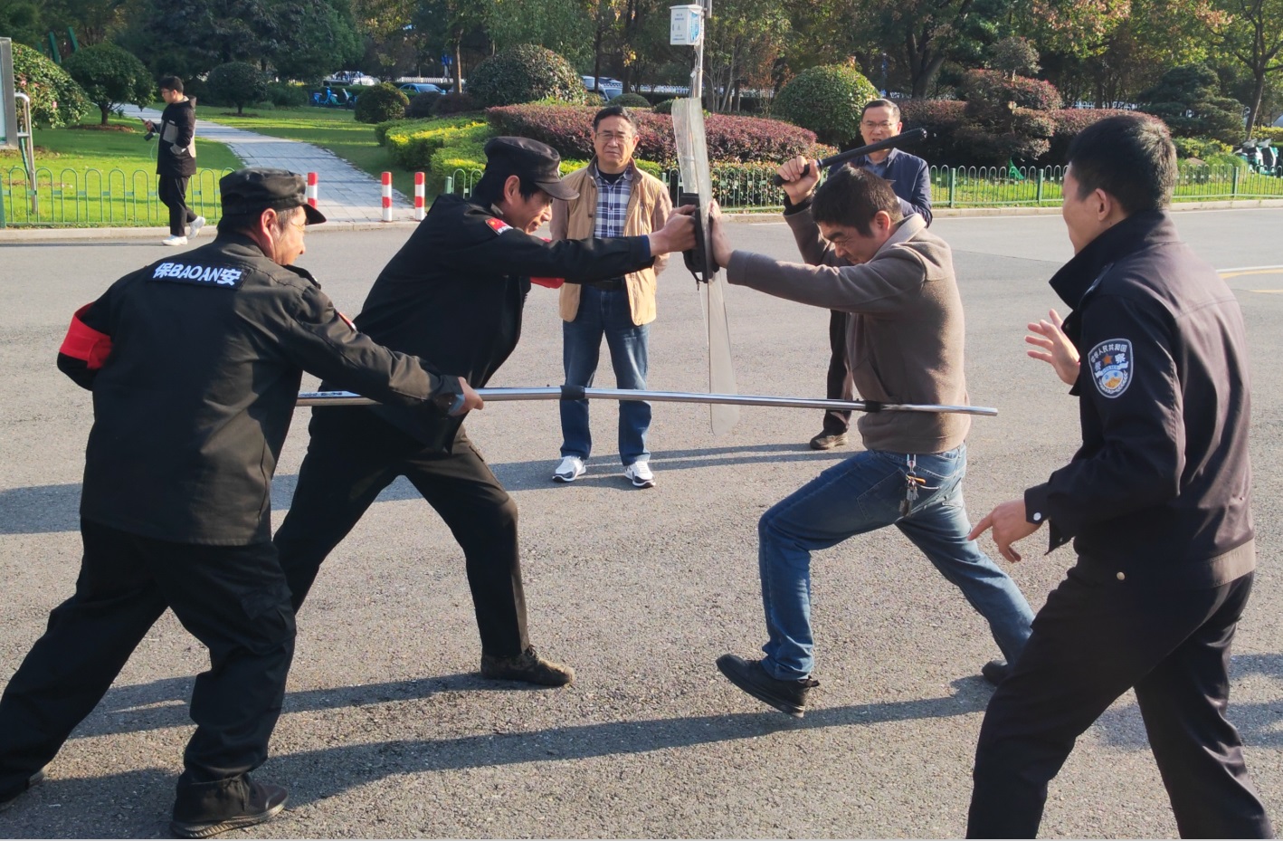 理论培训结束后,一场高度还原的模拟演练随即展开。随着“歹徒持械企图闯入校园”的警报信号响起,校门岗安保人员立即启动应急预案:警戒组迅速持防暴器械组成防御阵型,将“歹徒”阻拦在校门外;疏散组有序引导周边师生撤离至安全区域;通讯组同步拨打 110 报警并向学校保卫处报告警情。七里站派出所民警快速抵达现场,与校园安保人员密切配合,运用“盾挡叉制”战术精准控制“歹徒”,整个处置过程仅用时6分钟,展现出高效的协同作战能力。