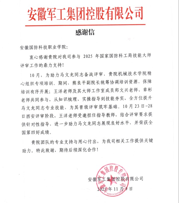 本网讯 近日,机械技术学院收到安徽军工集团控股有限公司发来的感谢信,信中就机械技术学院在2025年国家国防科工局技能大师评审工作中的鼎力支持表达诚挚谢意,字里行间满是对学院专业服务能力与育人水平的高度认可,成为学院深化产教融合、赋能产业发展的又一有力见证。