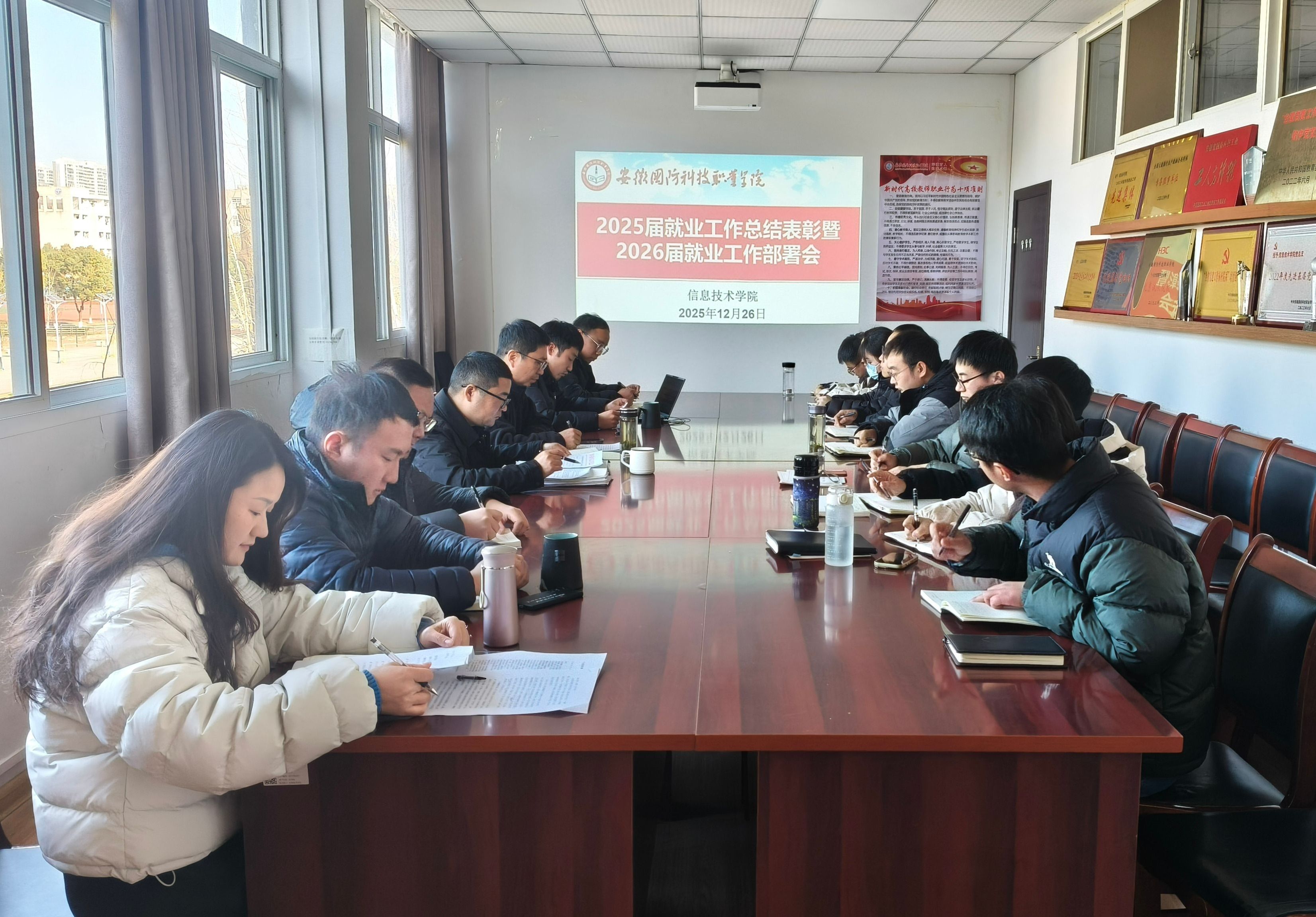 本网讯(信息技术学院 徐祥)为全面总结2025届毕业生就业工作成绩与经验,表彰先进,同时科学谋划、全力推进2026届毕业生就业工作,12月26日,我院顺利召开2025届就业工作总结暨2026届就业工作部署会。学院党总支书记王胜、副书记杜洪宇及全体辅导员参加会议,会议由徐祥主持。