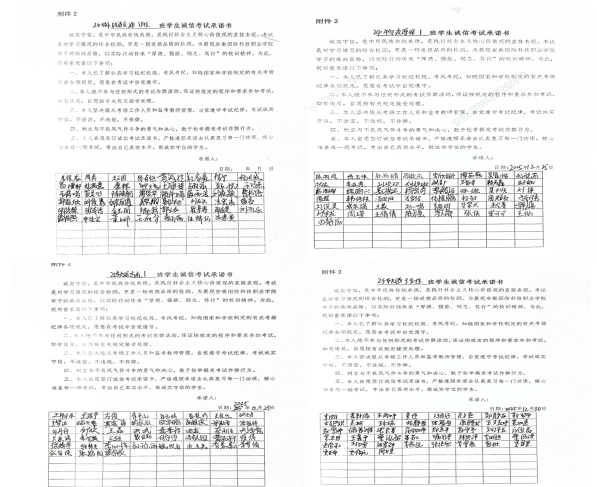诚信教育,强化考风。各班级辅导员通过召开以“树良好学风,筑成才之路”为主题的诚信考试班会,开展诚信考试教育,签署诚信考试承诺书和学风建设倡议书,将诚信考试作为塑造优良学风的重要抓手,强化学生诚信意识,培养学生诚信品质,引导学生养成良好的学习习惯和生活习惯,遵守课堂纪律,明确学习目标,认真复习迎考,取得优异成绩。