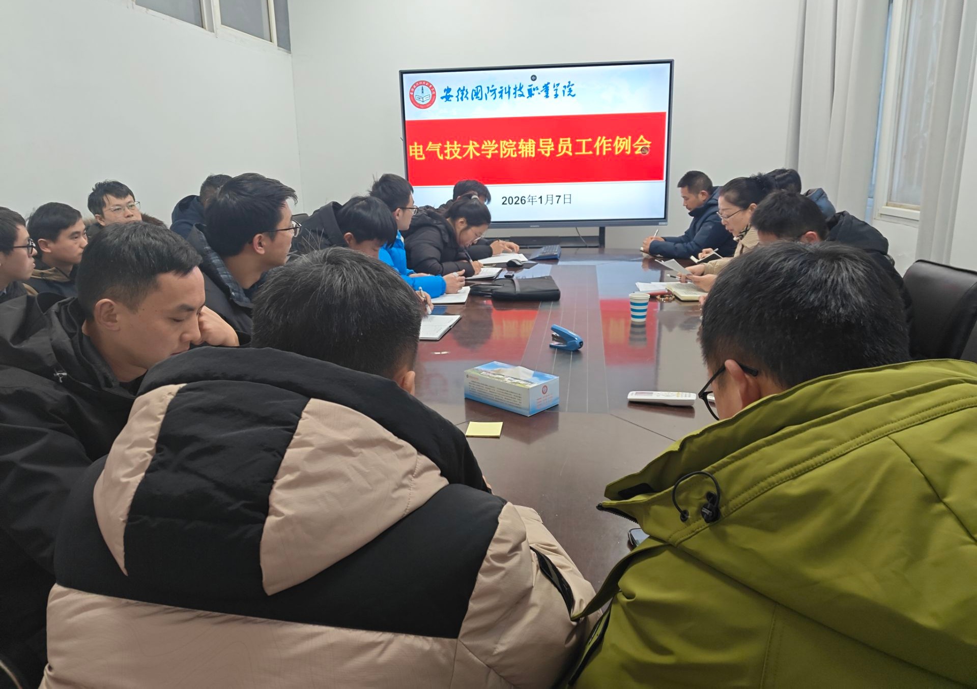 本网讯(电气技术学院 申晓伟)根据学校《关于2026年寒假前后有关学生工作安排的通知》(校学函〔2026〕1号)文件精神,1月7日,电气技术学院在知行楼102召开期末辅导员工作会议,布置学期末学生教育管理与服务工作。会议由学院党总支副书记张丽主持,全体辅导员参会。