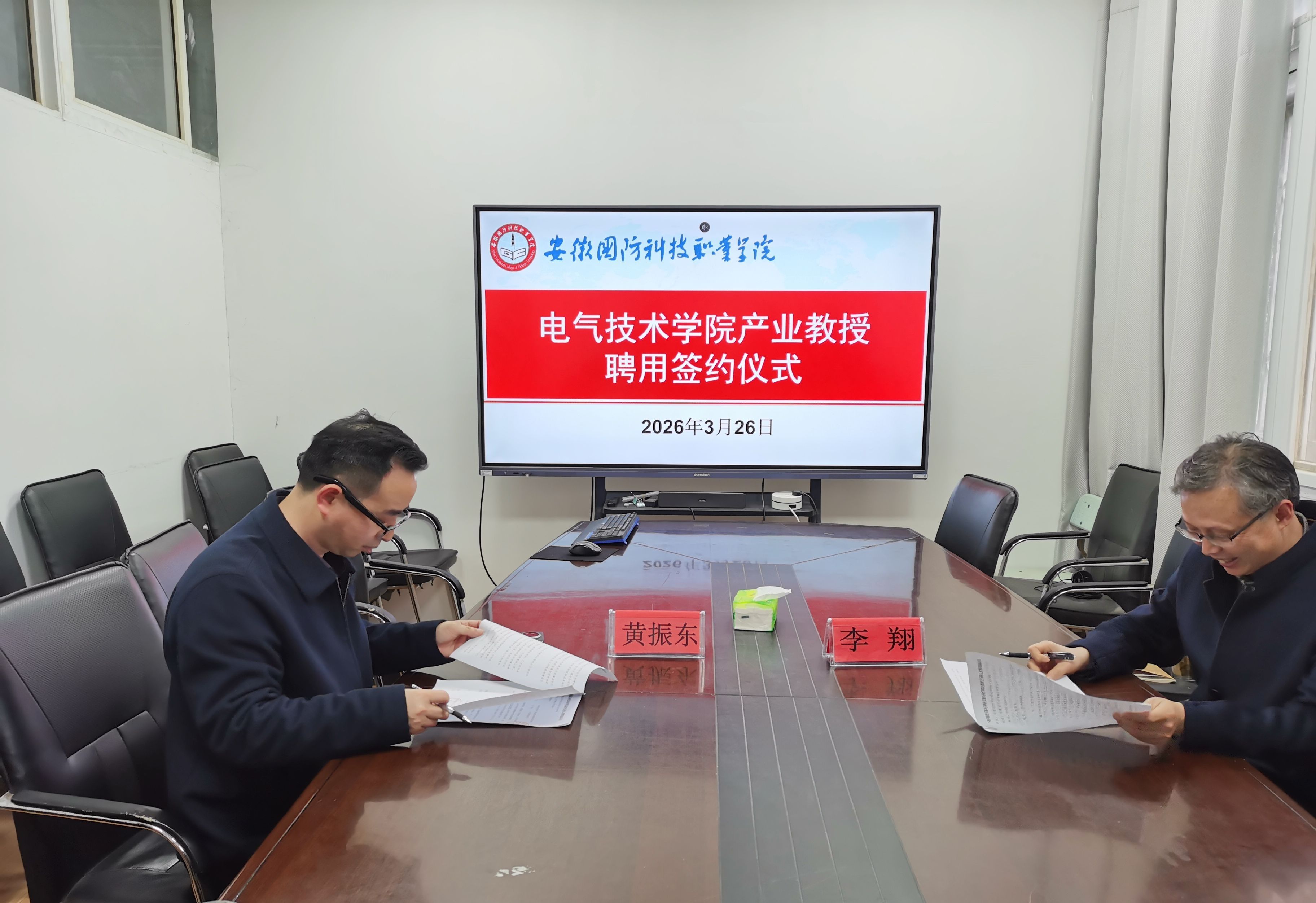 考核结束后,举行新一轮产业教授聘用签约仪式。电气技术学院与黄振东正式签订2026-2027年度产业教授聘用协议书,聘任其继续担任产业教授。协议明确聘期内岗位职责及双方权利义务等事项,为后续工作开展提供坚实保障。