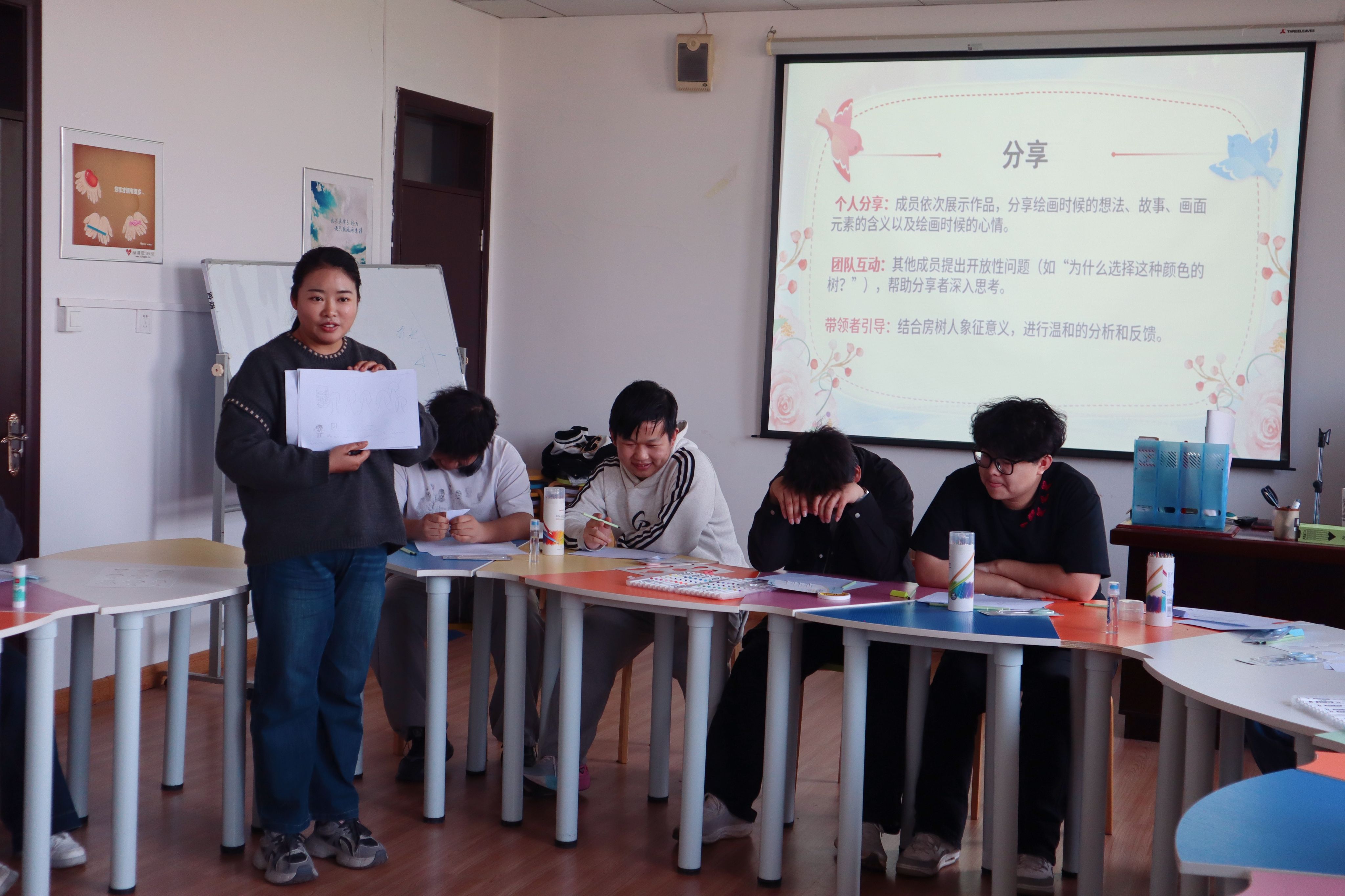 暖场环节中,同学们用词语或颜色分享心情,并参与“房树人”绘画。大家依次展示作品、讲述内心故事,成员间通过开放提问加深理解,带领者则结合绘画象征意义进行温和解读,现场氛围逐渐升温。