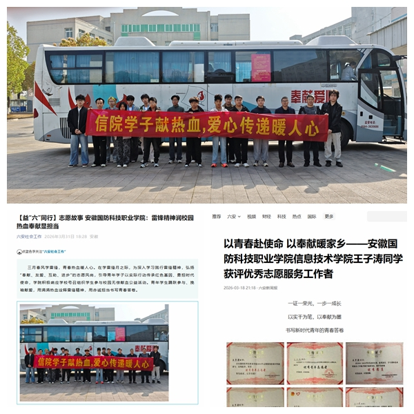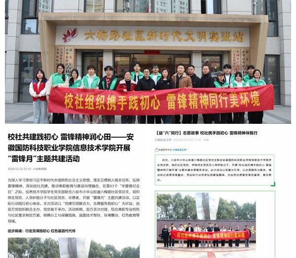 本网讯(信息技术学院 马士君)三月雷锋主题系列活动圆满落幕。安徽国防科技职业学院信息技术学院作为安徽省党建工作标杆院系,立足创建成效与党建引领优势,紧扣“学雷锋・文明实践我行动”主线,将标杆院系建设、党建育人体系、支部先锋效能融入学雷锋实践,结合雷锋精神传承与校社共建,以党建强根基、实践亮品牌、育人显担当,彰显省级党建标杆院系示范、引领与辐射力,构建新时代学雷锋工作格局,实现全员参与、全域践行、全程育人。