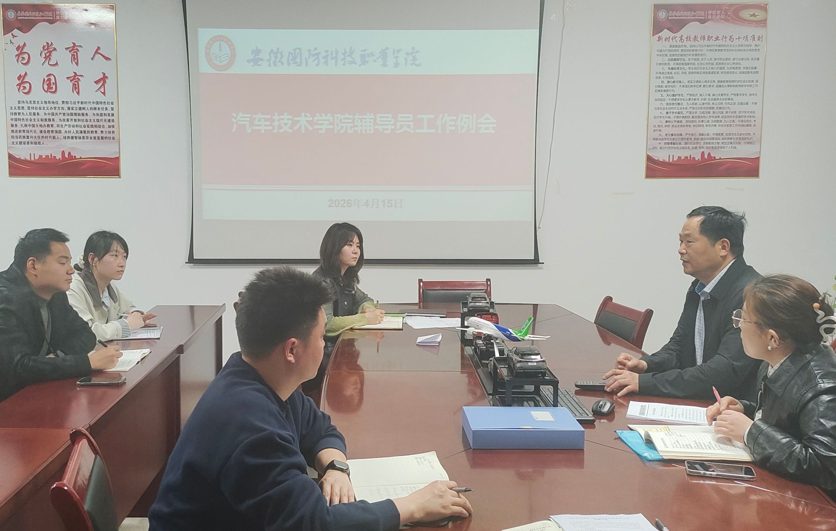 本网讯(汽车技术学院 黄世超)4月15日下午,汽车技术学院在知行楼416会议室召开辅导员工作例会,围绕近期学生工作重点任务进行部署安排,党总支书记孙良平、副书记陈梦雅及全体辅导员参加会议,会议由陈梦雅主持,