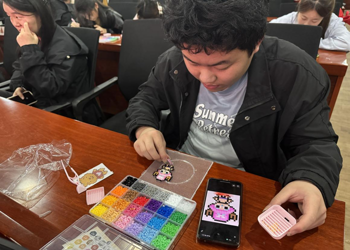 同学们坐在一起,挑选图案、搭配色彩,用镊子将一颗颗彩豆精准拼合,在沉浸式创作中平复情绪、舒缓压力。大家相互交流灵感、互帮互助,现场氛围温馨热烈,不少同学表示,在专注创作中暂时忘却了学业与生活的烦恼,收获了纯粹的快乐与温暖。