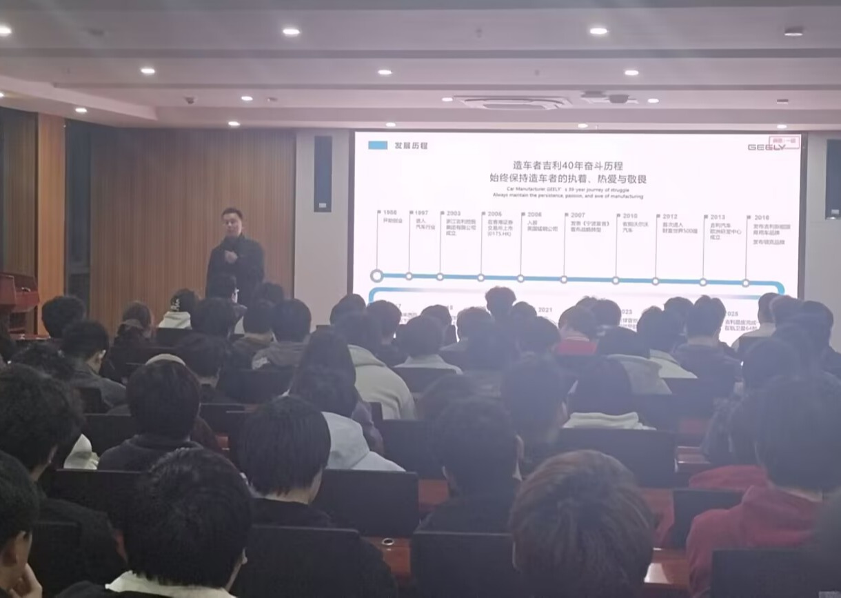 宣讲会现场,吉利控股集团招聘负责人周涵通过宣传片向在场的学生们展示了公司的历史沿革、发展成就以及企业文化,详细介绍了吉利集团的业务板块、技术创新能力以及未来的发展规划。他强调,吉利集团一直致力于技术创新和人才培养,希望通过与高校的合作,共同培养更多具有创新精神和实践能力的人才。之后,在场同学纷纷就公司的招聘流程、福利待遇以及职业发展等问题向负责人提问,周涵也耐心细致地一一解答,现场气氛热烈。