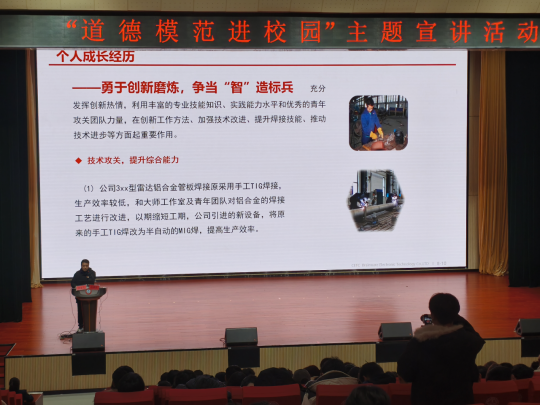 活动伊始,活动负责人杨智让参与活动的同学们有序进行排队签到,并维持现场秩序,下午15:50准时进行纸质和线上签到并有序进入产教融合中心大报告厅同上一堂大思政课”活动内容,向同学们介绍了道德模范张继菊、汪河池、李国辉、王芳的感人事迹,以及金志飞先生“从青马学员到时代先锋”的成长故事。这些榜样人物中,有扎根基层服务群众的社区工作者,有坚守岗位钻研技术的大国工匠,有投身公益传递温暖的志愿者,他们用实际行动诠释了责任与担当。