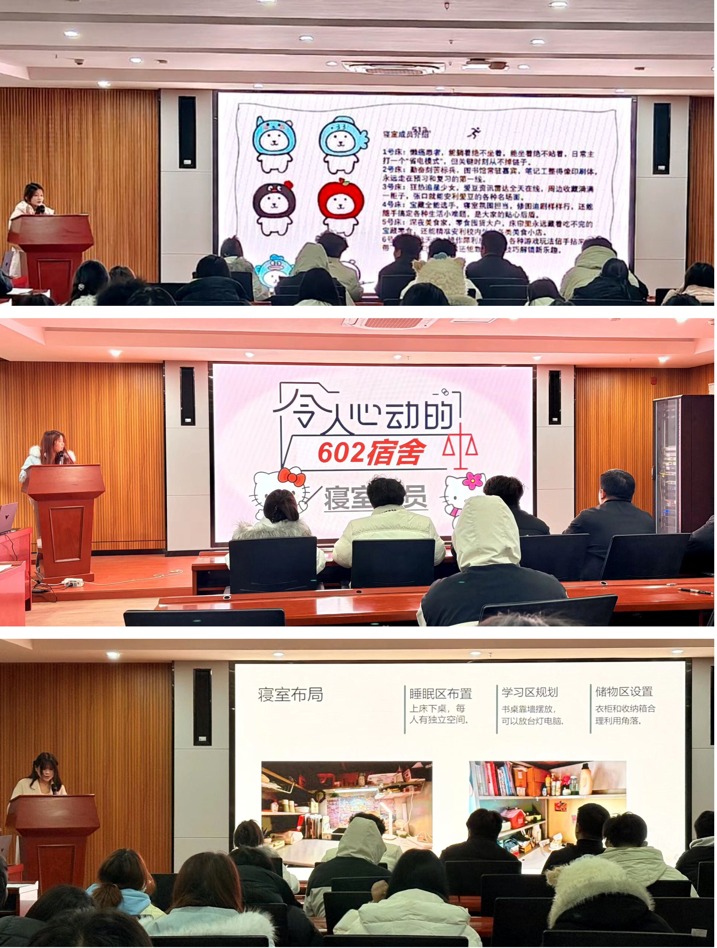 比赛现场氛围热烈温馨,各参赛宿舍代表携精心筹备的PPT依次登台汇报。汇报中,代表们通过生动鲜活的图片、详实具体的数据及真挚感人的故事,多维度呈现宿舍建设优异成果:卫生环境方面,展示窗明几净、整洁有序的居住空间,分享共同制定的值日表与定期大扫除机制;室友关系方面,讲述互帮互助、携手成长的温情点滴;学习氛围方面,分享宿舍共同制定的学习计划、组建的学习小组及定期开展的学习交流活动,展现勤学善思、互助共进的优良学风;日常习惯方面,强调规律作息、自律自省的生活态度;行为素质方面,展现文明有礼的处事风格与积极投身志愿服务的责任担当;安全意识方面,普及用电安全、防火防盗、网络安全等关键知识,凸显宿舍安全建设扎实成效。经过现场激烈角逐与师生评委团的公正严谨评选,最终评选出优秀宿舍一等奖2个、二等奖4个、三等奖6个。