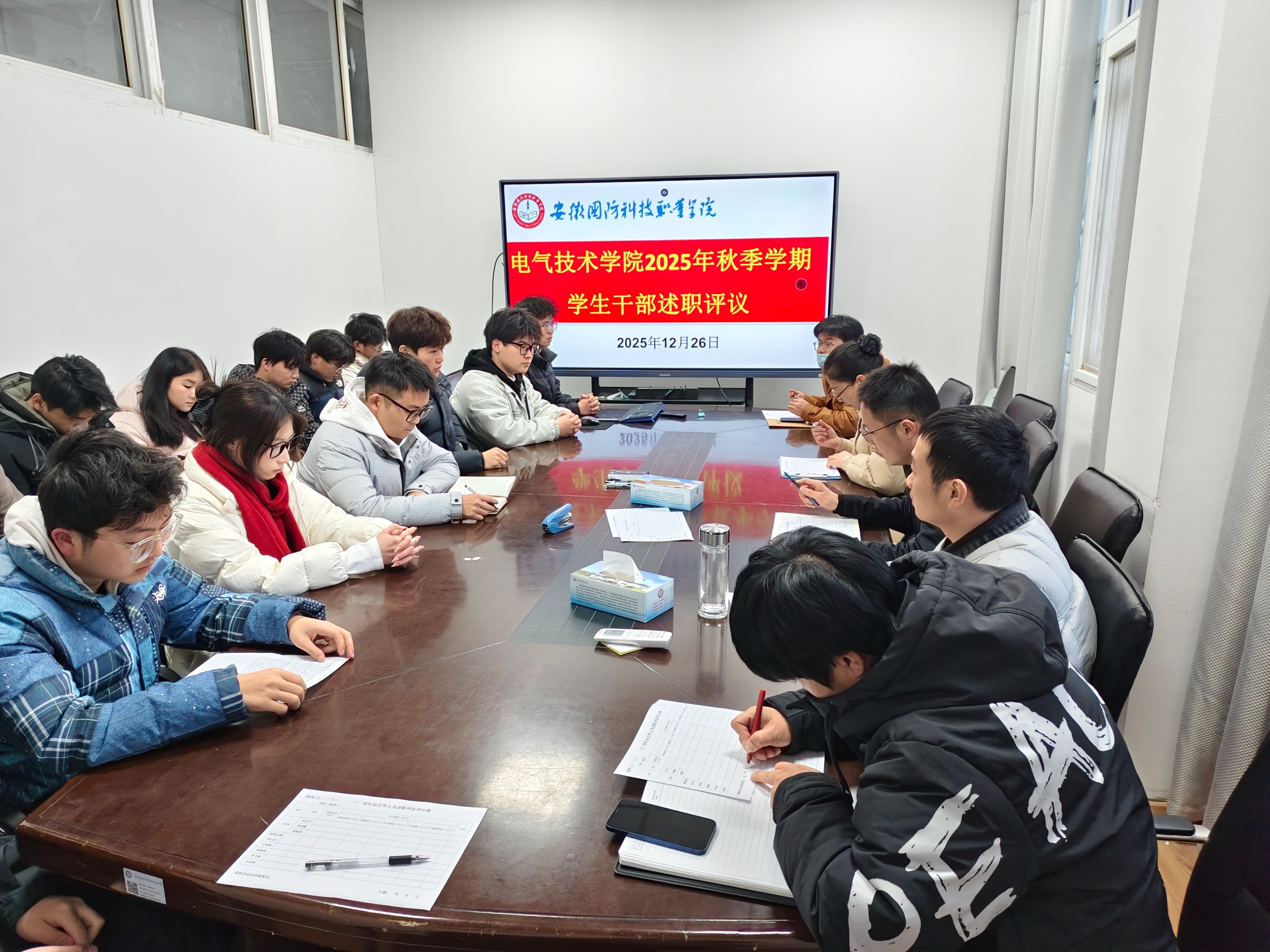 本网讯(学生通讯员 张宽洁)为进一步加强对我院学生会组织工作人员的管理和监督,强化学生会组织建设,提升学生干部的综合素养与服务能力。12月26日下午,电气技术学院在知行楼102会议室顺利召开2025-2026学年第一学期学生会工作人员述职评议会。电气技术学院党总支副书记张丽、团总支书记陈俊、辅导员吴泽建、卢明瑞、孙焕参加了此次会议。