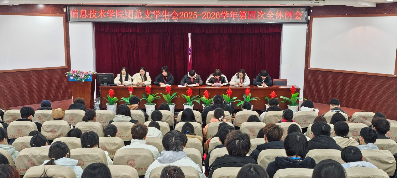 本网讯(学生通讯员 吴童周)为全面复盘本学期工作成效,明确寒假及下学期发展方向,信息技术学院团总支、学生会于1月5日在图书馆报告厅召开2025—2026学年第四次全体例会。会议由学生会主席团成员胡俊主持,学院团总支、学生会全体成员参会。
