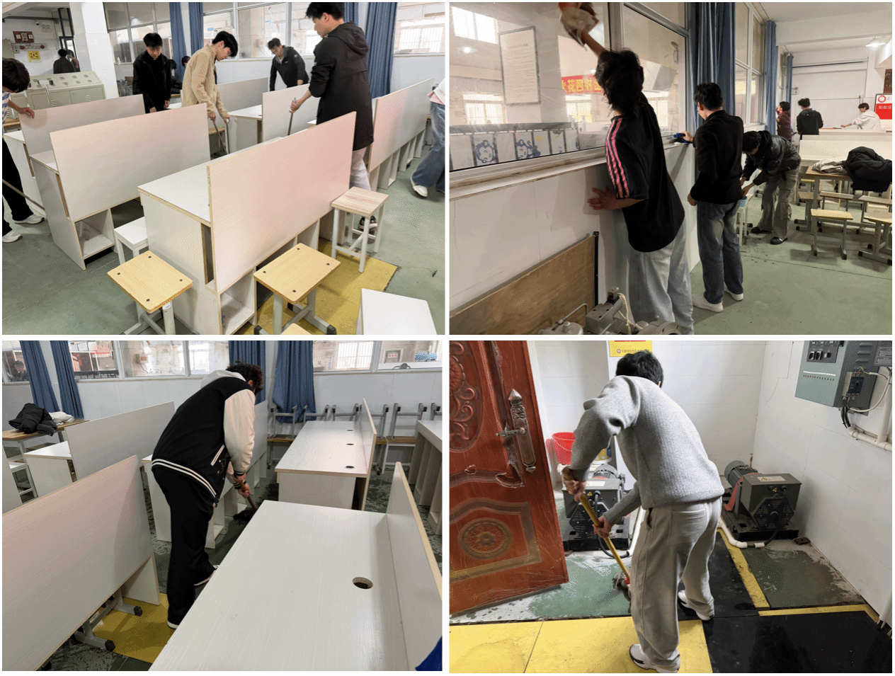 分工协作,干劲十足。 动员会后,成员们迅速投入劳动。大家分为三组:第一组负责擦拭实训设备与桌椅,细致清理每一处油污灰尘;第二组专注地面清扫与拖洗,不放过任何卫生死角;第三组对门窗玻璃及公共区域进行深度清洁。经过近两个小时的辛勤劳动,实训室面貌焕然一新,窗明几净,设备整齐,为师生创造了更加舒适的学习环境。