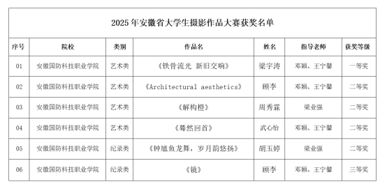 近日,2025年安徽省大学生摄影大赛获奖名单正式公布。在我校邓颖、王宁馨等老师的悉心指导下,学子们凭借出色的艺术视角和扎实的摄影功底,从众多参赛者中脱颖而出,斩获艺术类一等奖、二等奖及纪录类三等奖等多项荣誉,成绩斐然,充分展现了我校美育教育的丰硕成果与长足进步。