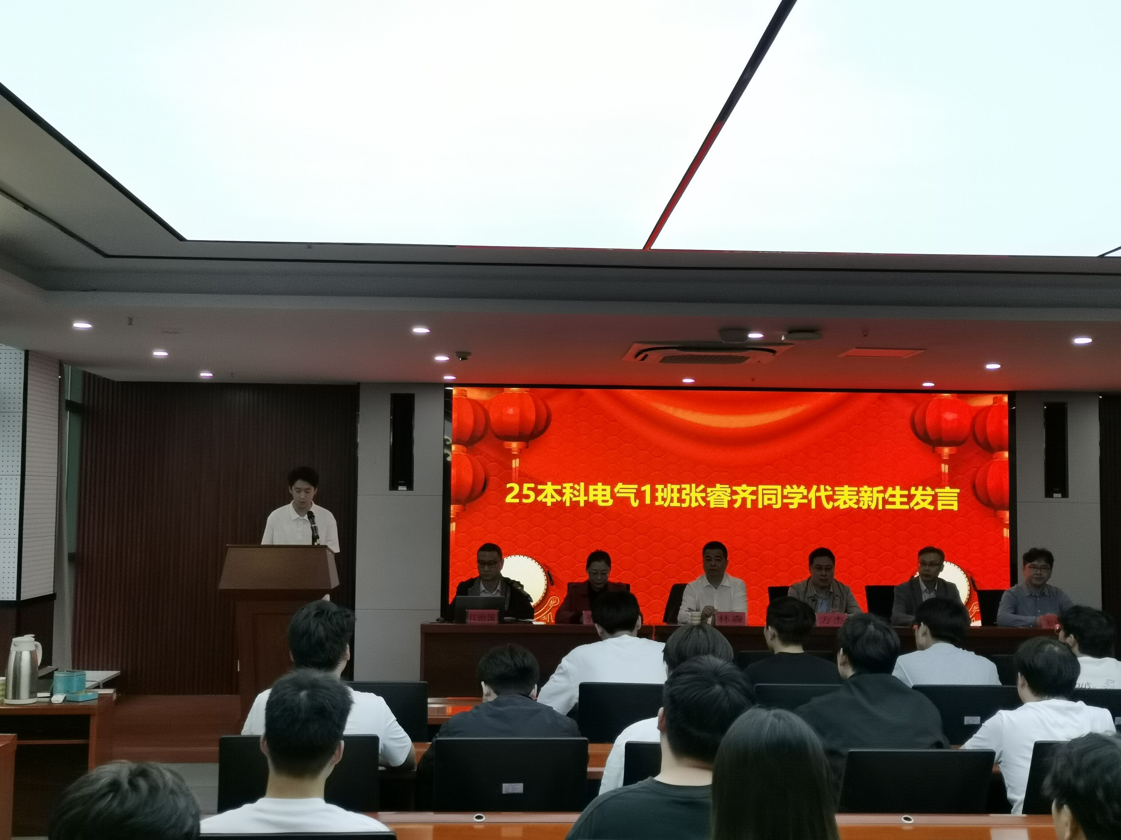 25本科电气1班张睿奇同学代表2025级新生发言,张睿奇同学表示,将立足新的起点,开启人生的崭新篇章,新的起点意味着新的责任与使命,同学们将珍惜这来之不易的学习机会,在学好专业知识的同时,积极参与校园文化活动和社会实践,全面提升自身综合素质,为实现自己的人生目标而奋斗。