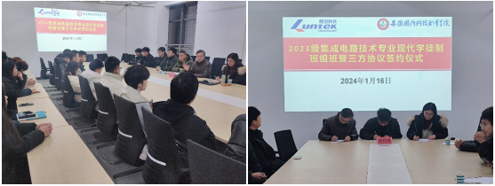 1月16日下午,电气技术学院与杭州朗迅科技股份有限公司在产教融合中心3楼会议室举行“朗迅现代学徒制班”组班及三方协议签约仪式。杭州朗迅科技股份有限公司区域经理崔晓阳、电气技术学院院长李翔、集成电路专业教师及2023级“朗迅现代学徒制班”全体学生参加了组班及签约仪式。仪式由电气技术学院副院长江治国主持。