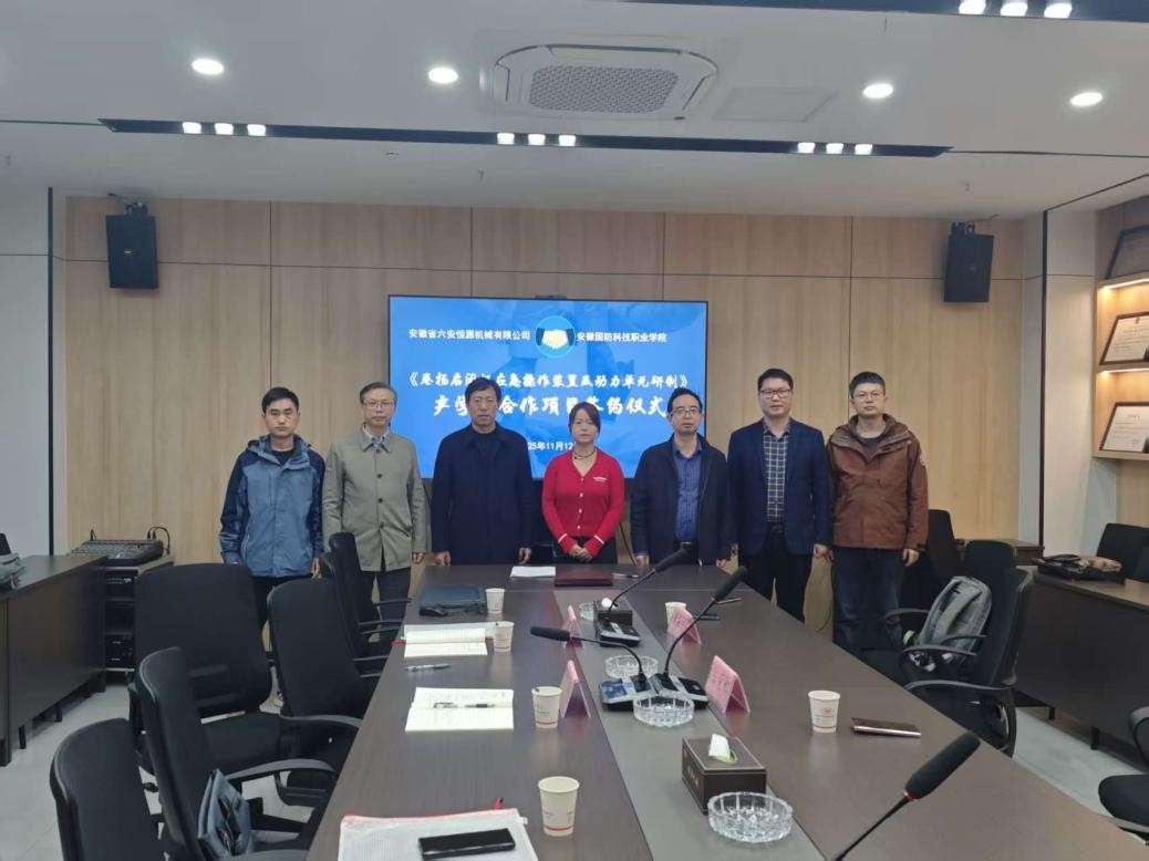 本网讯(电气技术学院 张超)11月12日,安徽国防科技职业学院党委委员、副校长袁旗带领电气技术学院院长李翔等一行6人,前往安徽省六安恒源机械有限公司开展访企拓岗活动,并举行产学研合作签约仪式。公司总经理陈荣娜、总工程师黄振东热情接待了来访一行,双方围绕人才培养、人才需求、技术攻关、平台建设等议题展开深入交流,并共同签署了《卷扬启闭机应急操作装置及动力单元研制》项目合作协议,续写校地企协同发展新篇章。