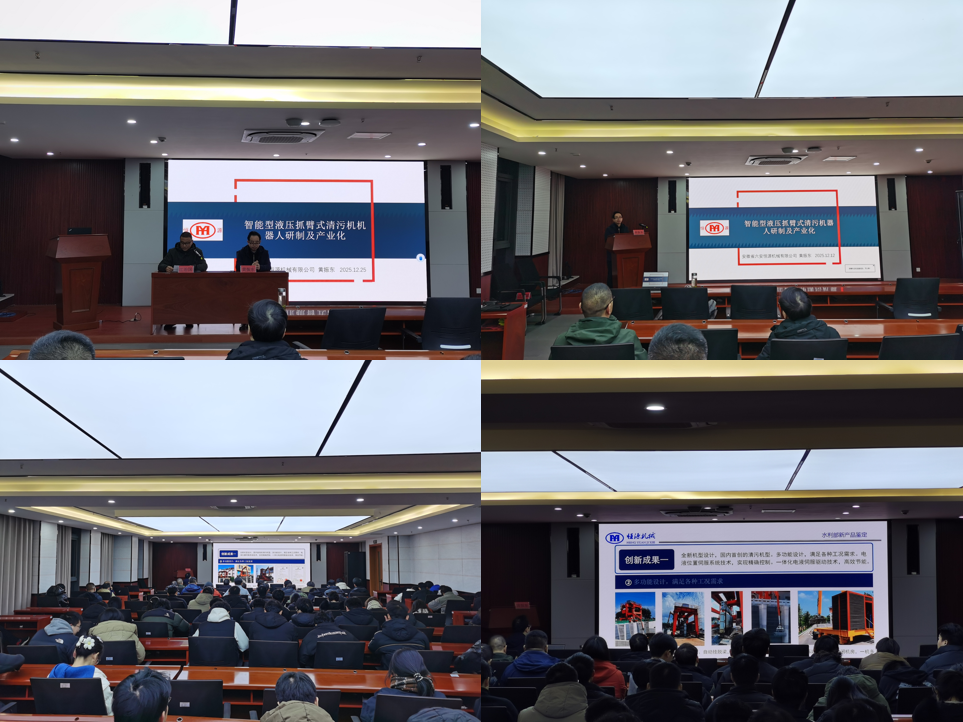 讲座中,黄振东教授结合自身多年工程实践经验,从企业发展、技术创新、产业应用、产学研合作四大维度展开分享。作为国家级高新技术企业、国家专精特新“小巨人”企业,六安恒源机械深耕水工机械领域,拥有6个省级研发平台和98项国家授权专利,主导产品在安徽省市场占有率连续多年超 75%。其研发的智能型液压抓臂式清污机器人作为国内首创机型,融合电液位置伺服系统、轨迹在线修正等多项前沿技术,单爪最大清污能力达4000公斤,每小时可清理垃圾100多吨,效率较传统设备提升5-6倍,末端轨迹精度仅3mm,整体技术达到国际领先水平。教授还详细介绍了产品在引江济淮、淮水北调等国家重点工程的应用成果,以及与合肥工业大学、芜湖哈特机器人研究院的产学研合作经验,展现了“校企协同、创新赋能”的发展路径。