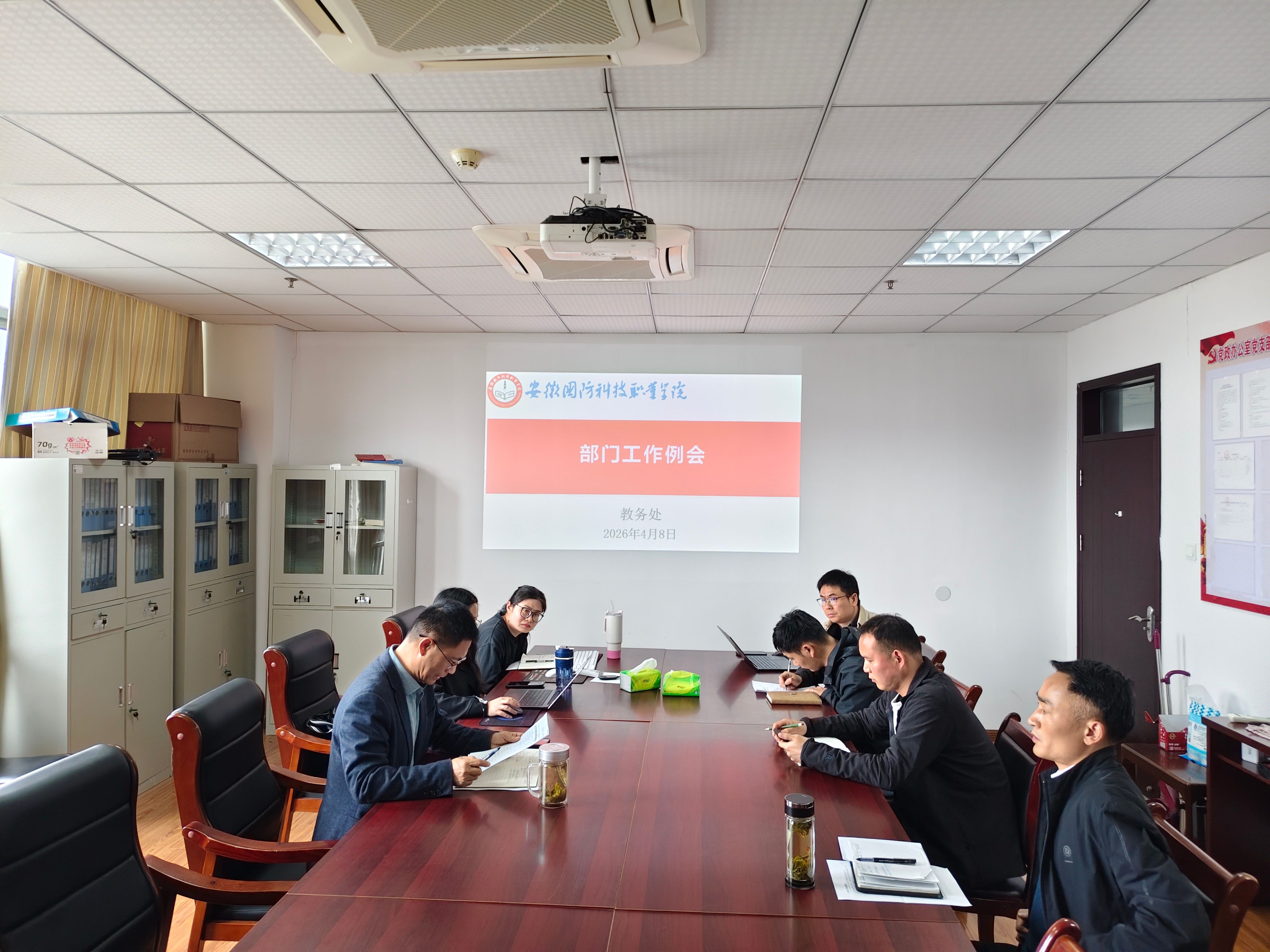 4月8日下午,教务处在秉心楼1206会议室召开部门工作例会,部门全体教职工参会。会议由教务处处长朱修传主持。会上,朱修传带领全体参会人员学习《中共安徽省委教育工委 安徽省教育厅关于印发2026年工作要点的通知》,并于与参会职工进行深入讨论。