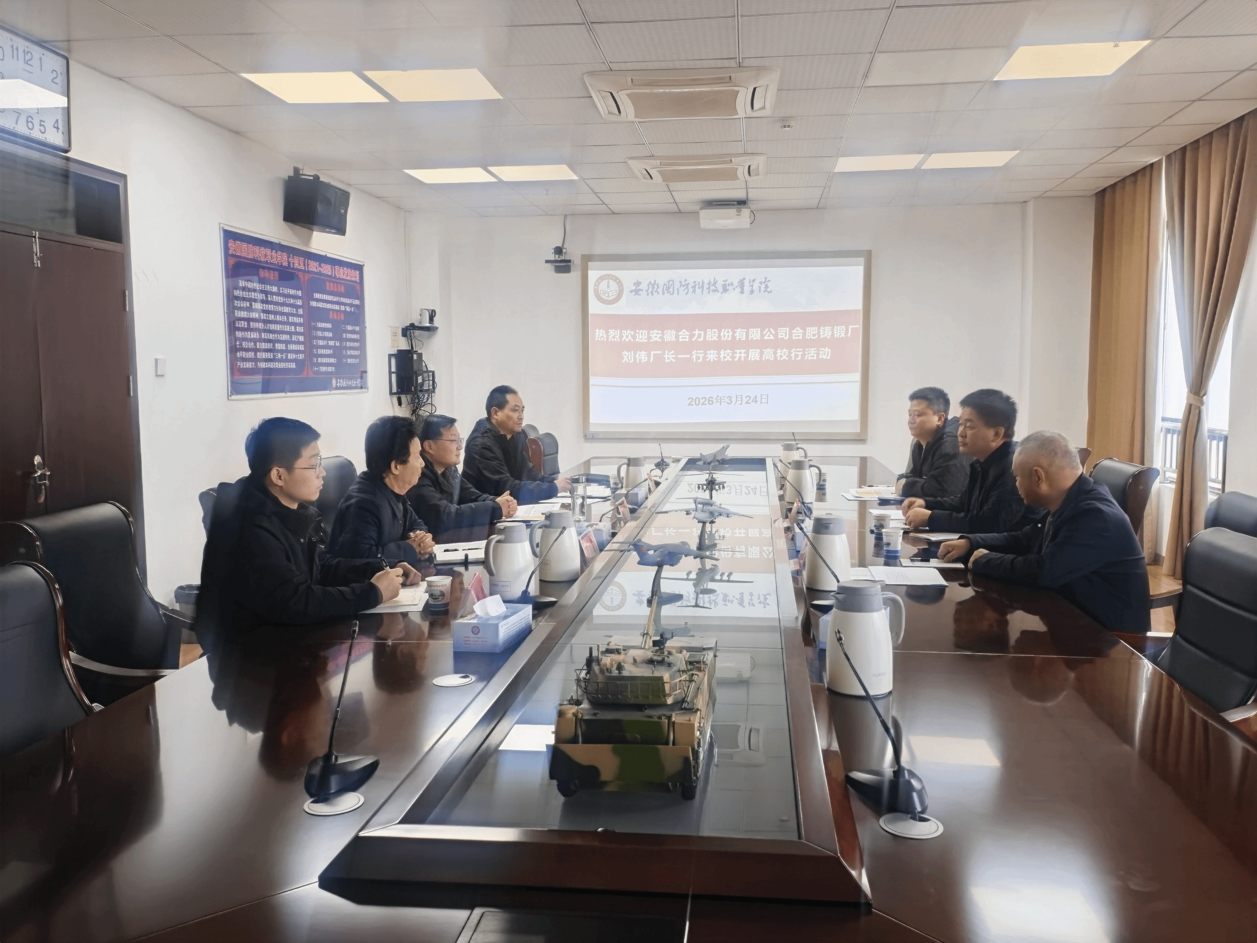 (机械技术学院 陈建)3月24日下午,安徽合力股份有限公司合肥铸锻厂刘伟厂长一行来校开展校企合作交流,校党委副书记、校长徐正红热情接待刘伟一行,校招生就业办、机械技术学院相关同志参加座谈交流会。