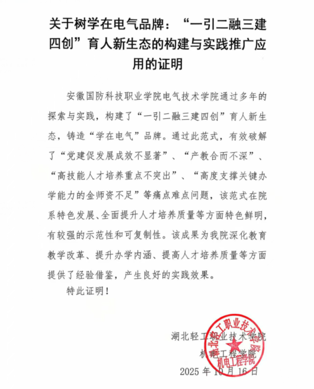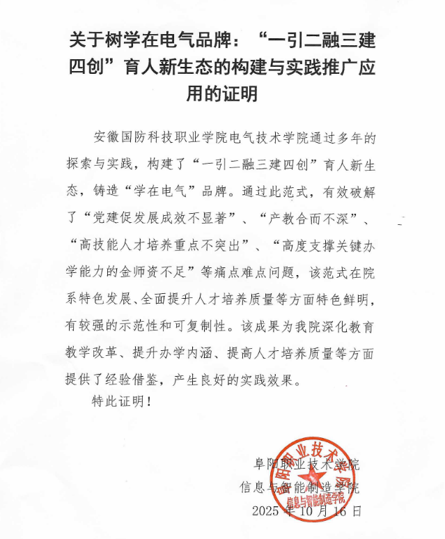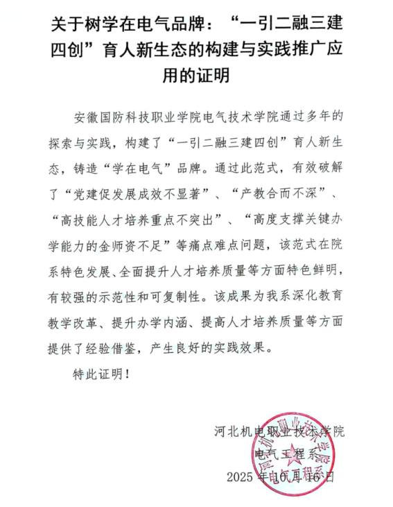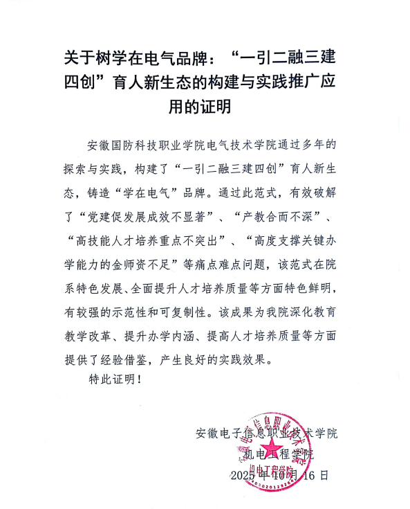 1、电气技术学院自2017年7月建院以来,以“五金建设”为核心主线,通过树学在电气品牌:“一引、二融、三建、四创”育人新生态的构建与实践实现跨越式发展,在校生从2017年的580人增长至2025年2376人(300%增幅),专业从4个扩展至6个,2025届毕业生校招岗位供需比达5:1,起薪中位数5200元/月,成为区域智能制造、智能控制、新型储能、集成电路人才供给核心基地。先后荣获省级教学成果一等奖3项,二等奖3项,多次荣获校级部门年度考核优秀等次。相关成果不仅在本校内进行推广应用,还在河北机电职业技术学院、安徽电子信息职业技术学院等省内外10多所兄弟院校进行了推广,同时多次在安徽日报、安徽财经网、安徽省教育厅网站、今日头条上宣传报道。