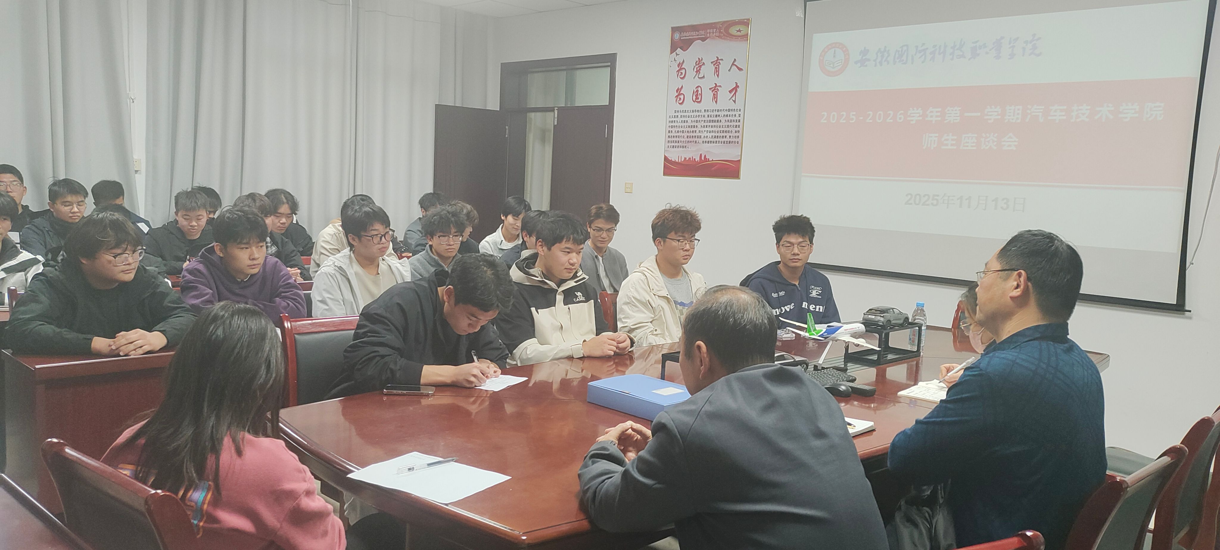 本网讯(汽车技术学院 黄世超)为充分了解在校各班级学生的学习、生活状况,促进师生间的交流与互动,汽车技术学院于11月13日下午召开师生座谈会,会议由学院党总支副书记陈梦雅主持,学院领导、教研室主任、实训室主任、辅导员及班级学生代表参加了此次座谈会。