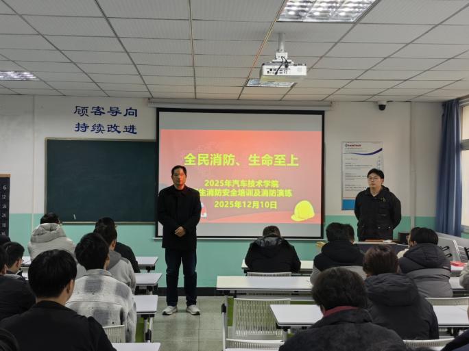 本网讯(汽车技术学院 刘晓宇)为落实学校消防安全主体责任,切实提高广大学生、教职工消防安全意识和自救互救能力,坚决防范和遏制火灾事故发生,12月10日下午,汽车技术学院组织开展“2025年汽车技术学院实验实训室消防安全培训及消防演练”活动。
