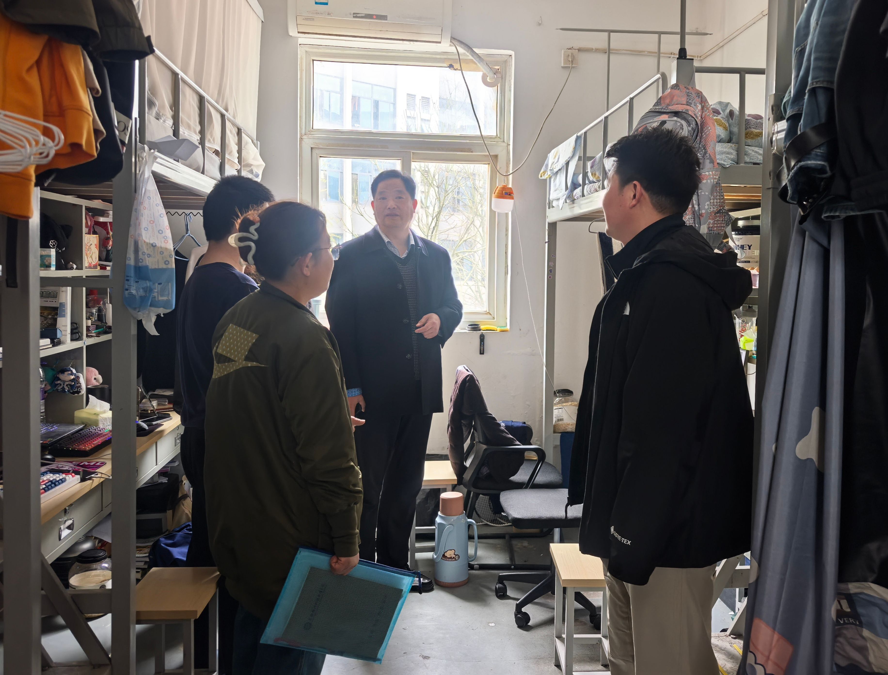 孙良平强调,宿舍是学生在校期间的“第二课堂”,全体同学要严格遵守宿舍管理规定,从规范用电、保持整洁等细节做起,将安全意识内化于心、外化于行。陈梦雅详细询问学生的学习生活状况与住宿需求,耐心倾听大家在作息调整、宿舍相处等方面的困惑,鼓励同学们合理规划时间,养成规律作息,在互助互爱中营造温馨和谐的宿舍氛围。辅导员们针对发现的问题逐一登记,建立整改台账,明确整改时限,确保安全隐患清零见底。