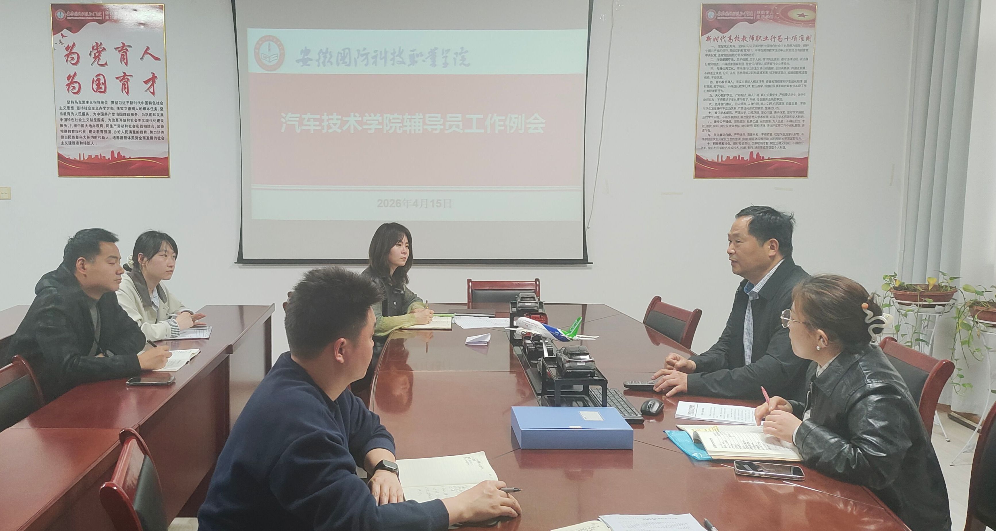 本网讯(汽车技术学院 黄世超)4月15日下午,汽车技术学院在知行楼416会议室召开辅导员工作例会,围绕近期学生工作重点任务进行部署安排,党总支书记孙良平、副书记陈梦雅及全体辅导员参加会议,陈梦雅主持,