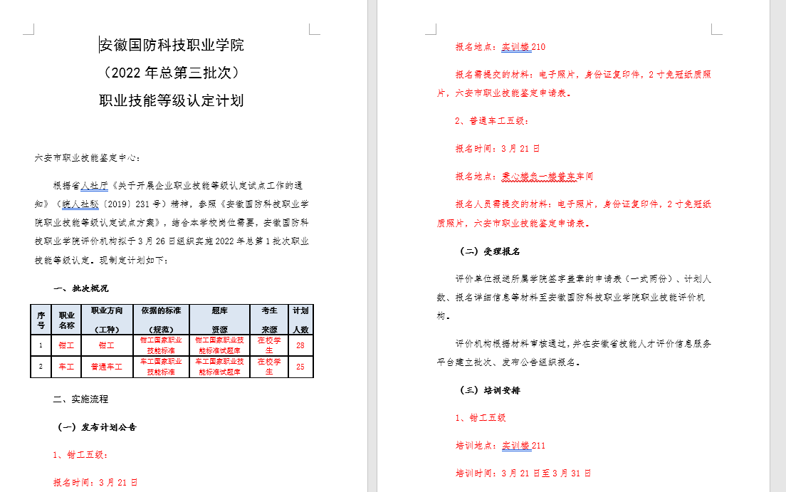 2、《安徽国防科技职业学院职业技能评价个人申报审核表》(附件4)(分清楚校内、校外,可填写后打印,也可以打印后手写。承诺部分学员自己签字填写)附件2和附件3人数需一致。