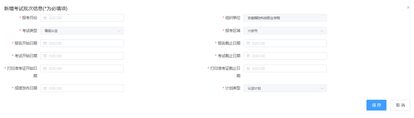 注:申报批次期间,承办学院负责人需配合继续教育学院填写如下信息:报名开始结束日期,打印准考证开始结束日期,具体信息见下图: