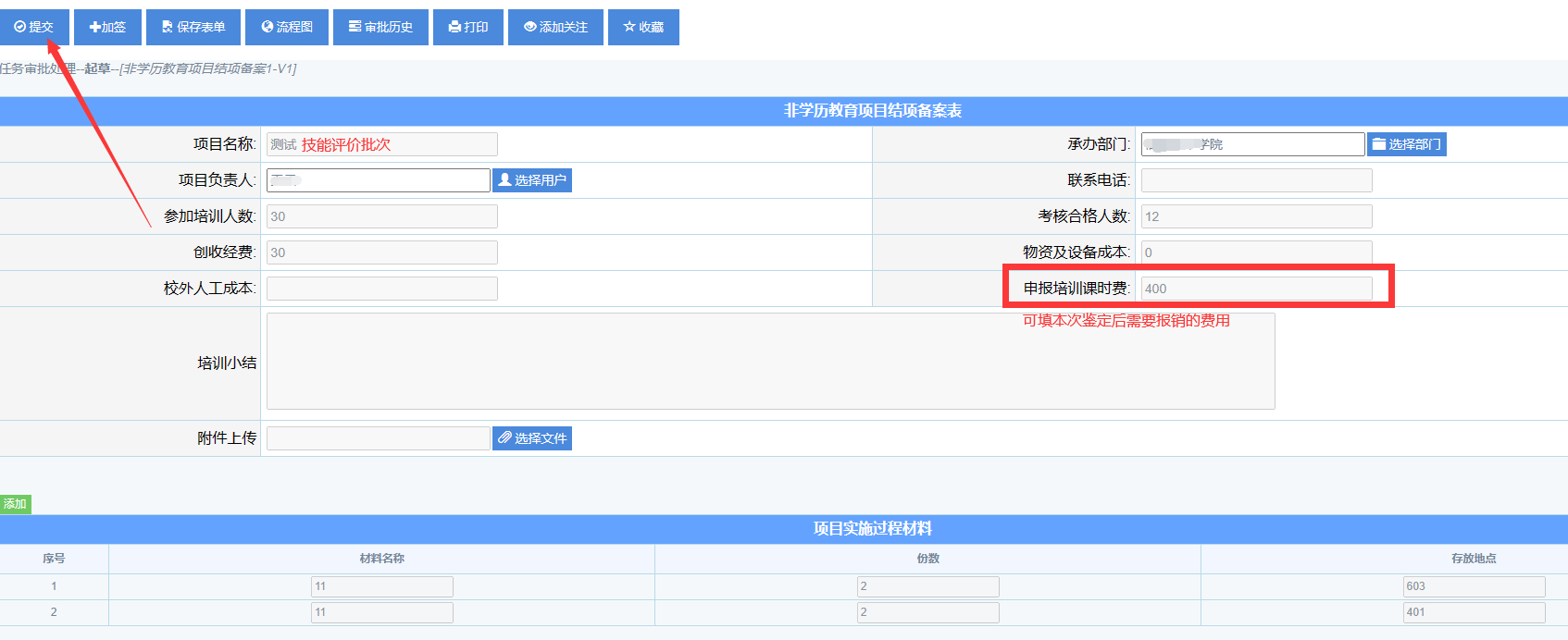 考试结束后一个月内,承办学院负责老师登录OA系统申请《非学历教育项目结项备案》,详细填写本次评价所开支费用,备案结束后打印单据,作为申请费用开支附件。
